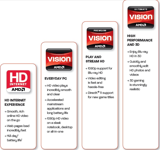 Deocamdată, compania a lansat două serii de produse Fusion: C, cu nume de cod Ontario (catalogat drept HD Internet) şi E, cu nume de cod Zacate (catalogat drept VISION). Pentru cei ce doresc performanţe superioare, AMD mai oferă VISION Premium şi VISION Ultimate, bazate pe procesoare Phenom II.