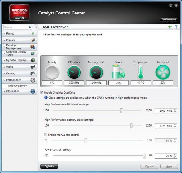 După cum puteţi observa mai jos, modulul AMD Overdrive din Catalyst Control Center oferă frecvenţe destul de generoase: 1200MHz pentru GPU şi 5000MHz pentru memoria video.