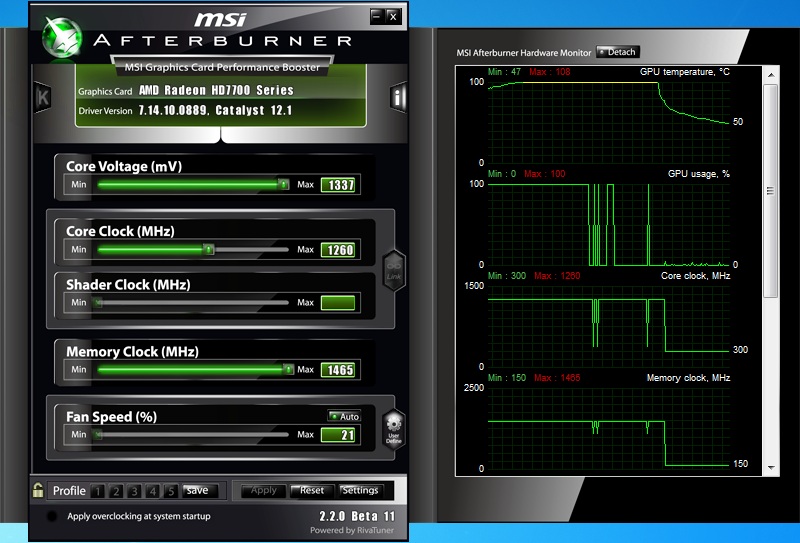 Trebuie să menţionez că acestea nu pot fi însă atinse în condiţii de stabilitate fără modificarea tensiunii de alimentare. De aceea, am apelat la MSI Afterburner, care oferă şi această opţiune.