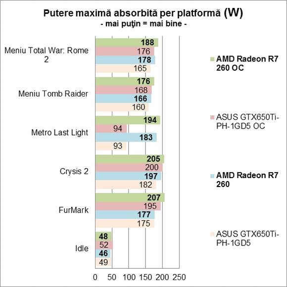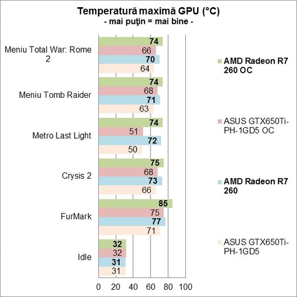 Evident că AMD Radeon R7 260 nu este placa video care să dea pe cineva pe spate, dar nici nu cred că vă aşteptaţi la aşa ceva. Ea se descurcă însă binişor, permiţând rularea unui număr destul de mare de jocuri la rezoluţie Full HD.Esenţial este însă preţul de achiziţie. Aşa cum vă spuneam la începutul acestei săptămâni, AMD recomandă comercializarea lui R7 260 la un preţ de 79E + TVA. În traducere liberă, asta ar însemna un preţ la raft de circa 440 Lei, care este mult mai bun decât cei 570 Lei ceruţi de ASUS pentru GTX650Ti-PH-1GD5. Şi este clar mai bine decât cel mai accesibil GeForce GTX 650 Ti disponibil pe piaţă, care pleacă de pe la 530 Lei. Aşadar, Radeon R7 260 a reuşit ce şi-a propus şi a lansat o nouă provocare pentru NVIDIA, care în acest moment nu stau foarte în acest segment. Urmărind acest joc de-a şoarecele şi pisica, este rândul NVIDIA să facă o mutare, dar probabil că acest lucru nu se va întâmpla mai devreme de jumătatea lunii ianuarie a anului viitor, când de altfel va deveni disponibil şi Radeon R7 260.