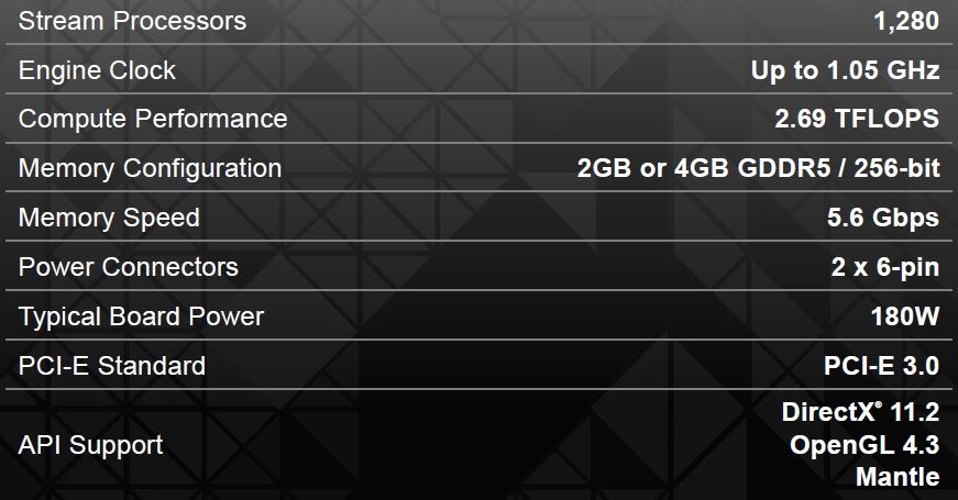 AMD R9 270X vine cu frecvenţele standard de 1050MHz pentru nucleul grafic Pitcairn dotat cu 1280 unităţi de procesare şi de 5600MHz pentru memoria video cu capacitatea de 2GB accesată prin intermediul unei interfeţe pe 256bit.
