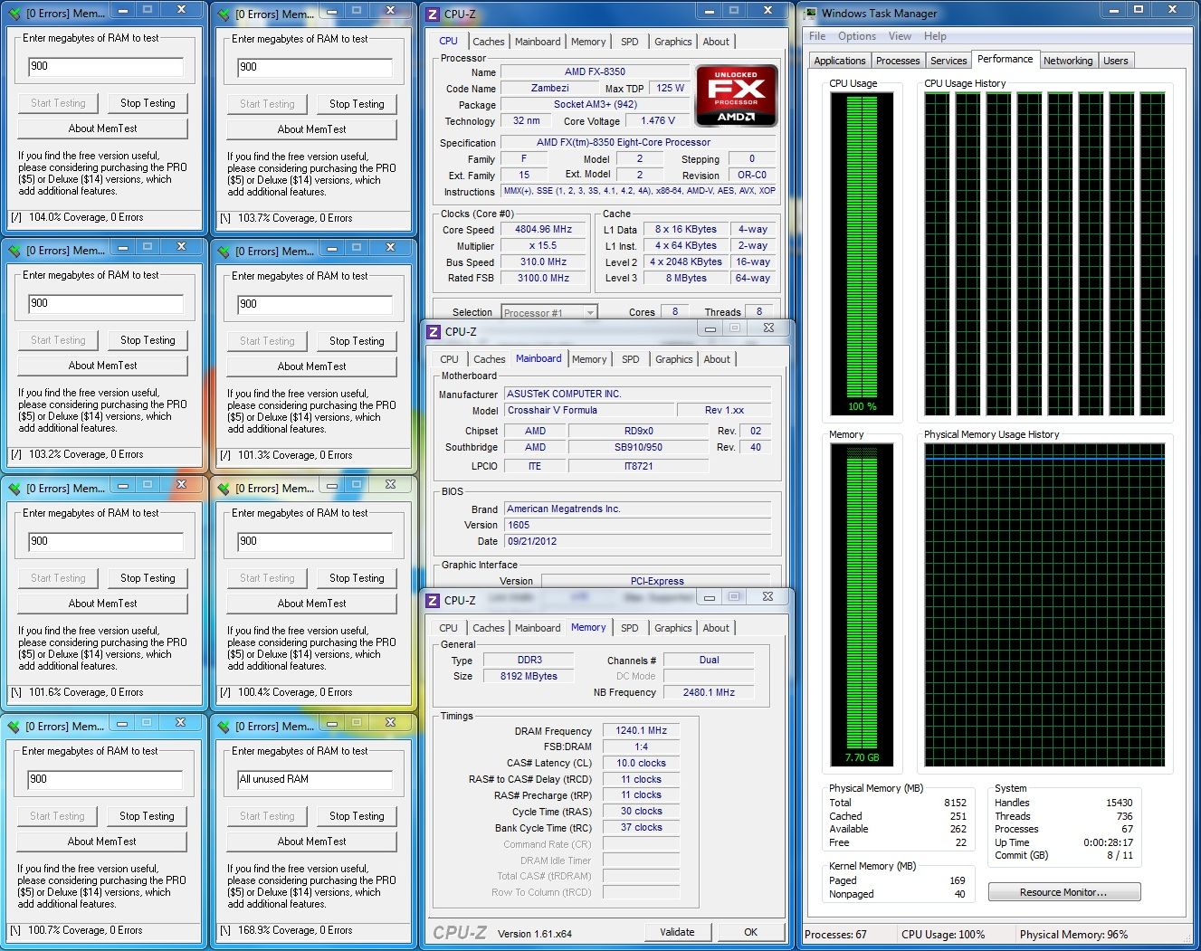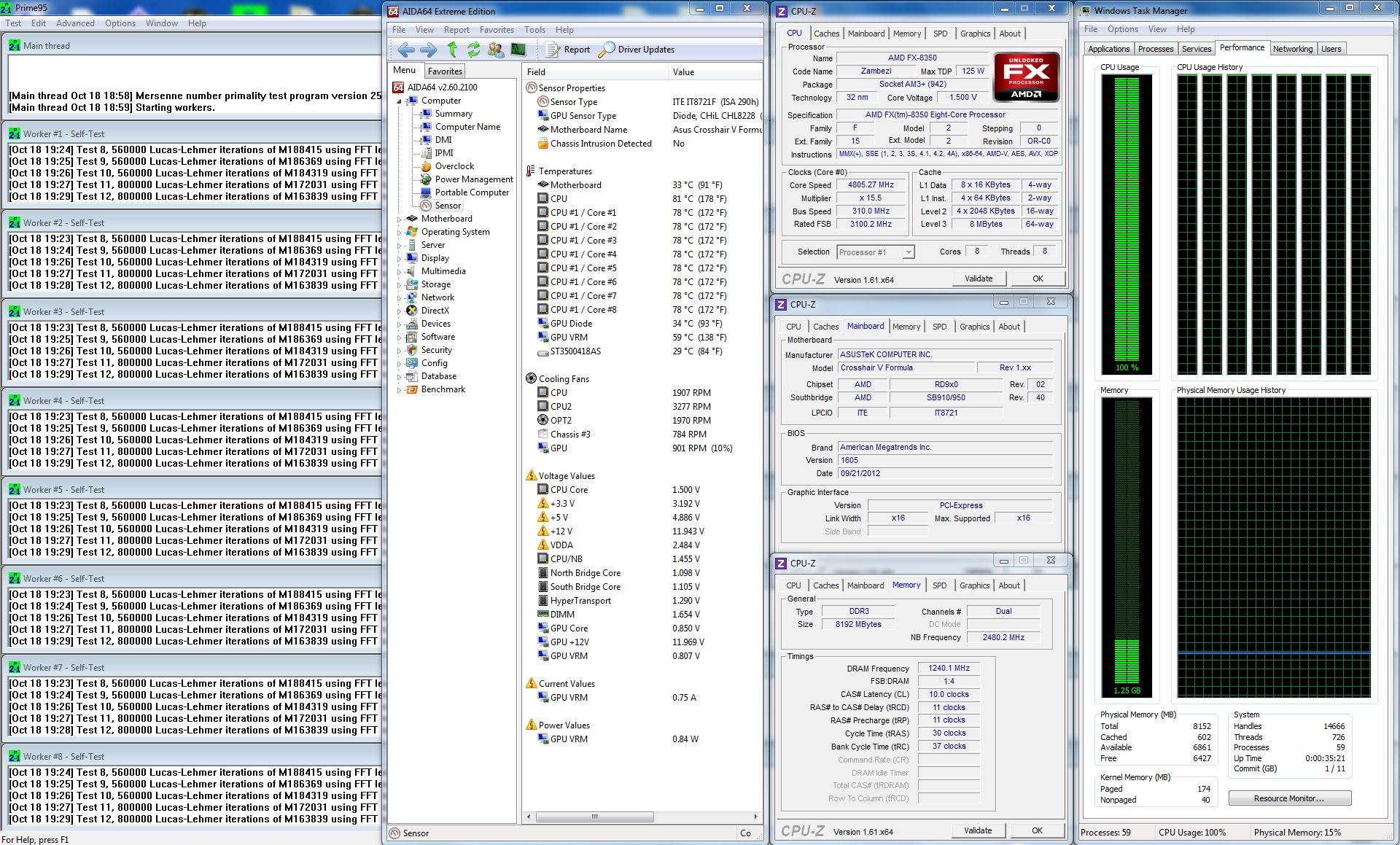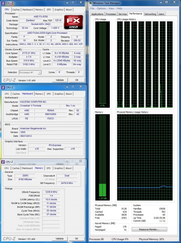 Am început aşadar să caut frecvenţa maximă suportată de FX-ul 8350 care mi-a picat în mână şi am descoperit în primă fază că tensiunea maximă pe care am putut-o aplica în BIOS pentru procesor fără a se manifesta mecanismul de protecţie a fost de 1.4375V. Cu o setare Extreme pentru Load Line Calibration, aceasta devenea în realitate, în sarcină, 1.5V. Apoi, a fost simplu să determin frecvenţa maximă în condiţii de stabilitate, situată în jurul valorii de 4.8GHz. Nu m-am mulţumit însă cu atât şi am căutat o combinaţie bus-multiplicator care să îmi permită să supratactez şi modulele de memorie RAM. Drept urmare, am obţinut o frecvenţă de 4805Mz (15.5x310MHz) pentru procesor şi 2480MHz pentru memoria RAM. Tot la 2480Mz a fost şi frecvenţa maximă pe care am putut-o aplica Northbridge-ului, în timp ce bus-ul Hyper Transport a funcţionat la 3100MHz după mărirea tensiunii de alimentare la 1.3V.