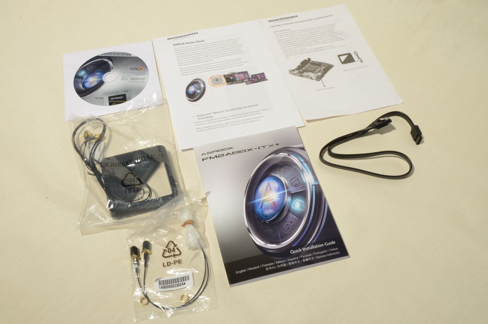 În interior, ar trebui să găsiţi ghidul de instalare, discul optic cu drivere şi aplicaţii, shield-ul pentruu back panel, 2 cabluri SATA, antenele 2.4/5GHz şi cablurile pentru conectarea antenelor. În cazul de faţă, unul dintre cablurile SATA şi shield-ul lipseau din pachet, semn că placa a mai vizitat şi alte publicaţii.