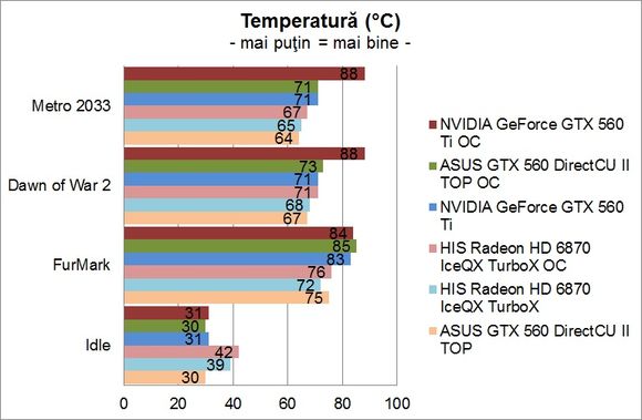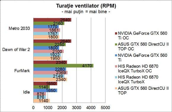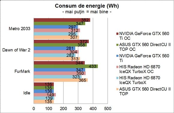 În privinţa consumului de energie, el este mai mic decât în cazul lui GTX 560 Ti, aşa cum era de altfel şi de aşteptat, dar m-aş fi aşteptat ca acesta să fie mai aproape de Radeon HD 6870.