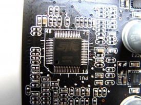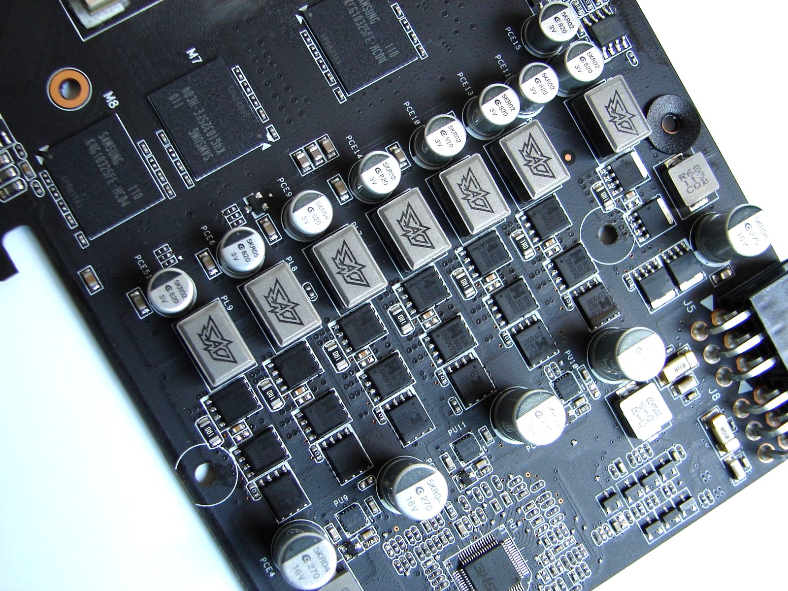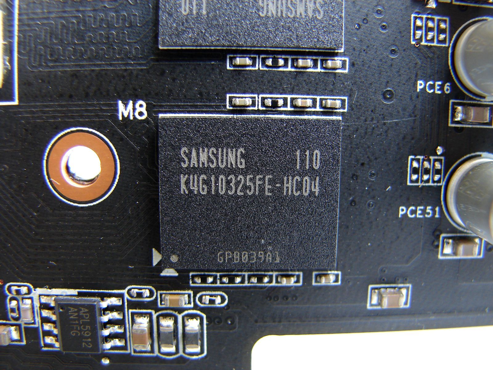 Memoria RAM GDDR5 cu capacitate de 1GB este obţinută din opt chip-uri Samsung K4G10325FE-HC04.