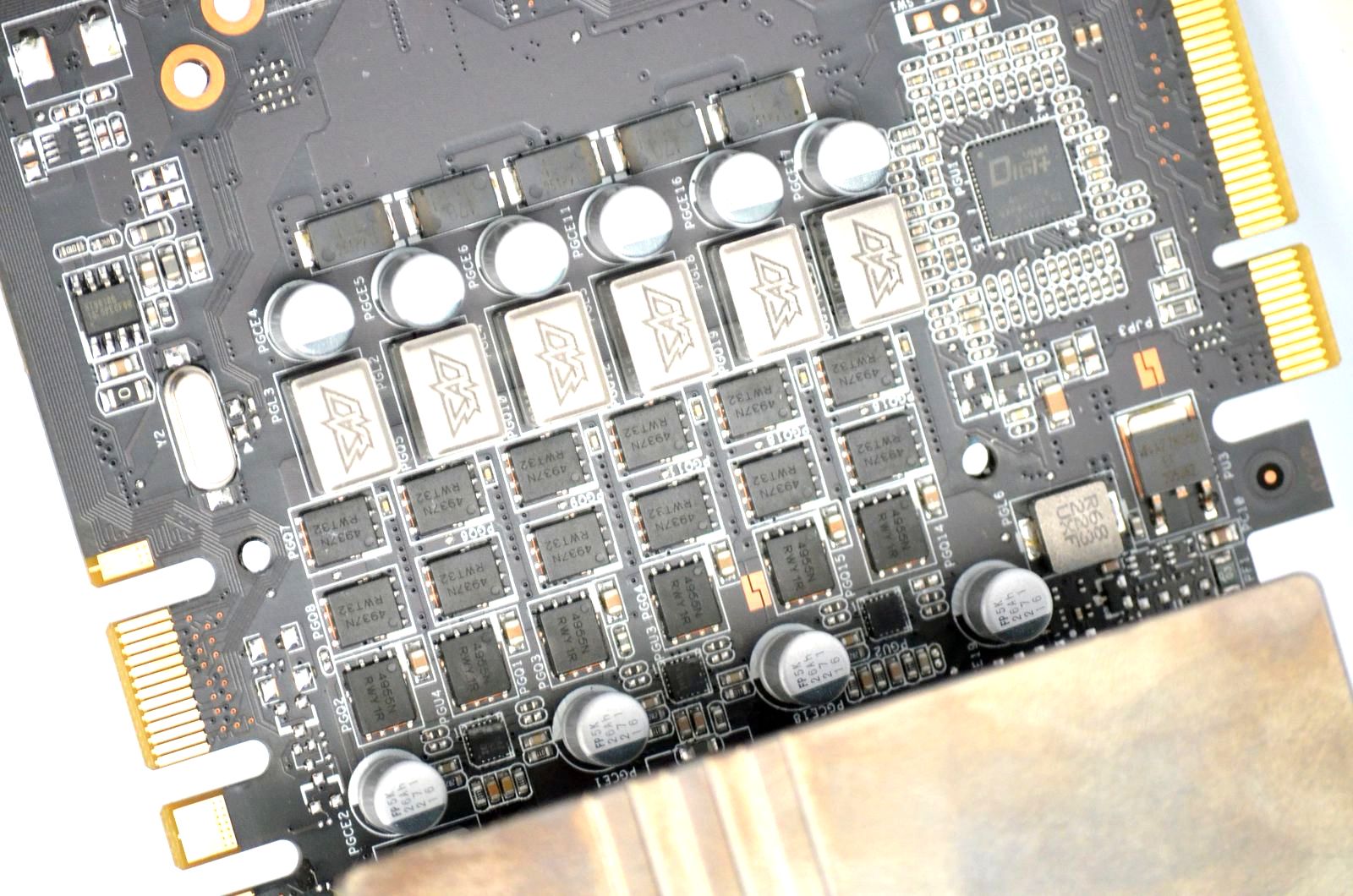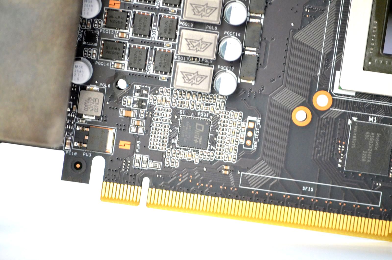Elementul principal, VRM-ul pentru GPU, este digital şi este format din 6 stagii. El este prevăzut cu un controller marcat Digi+. Un alt stagiu este folosit pentru alimentarea chip-urilor de memorie video.