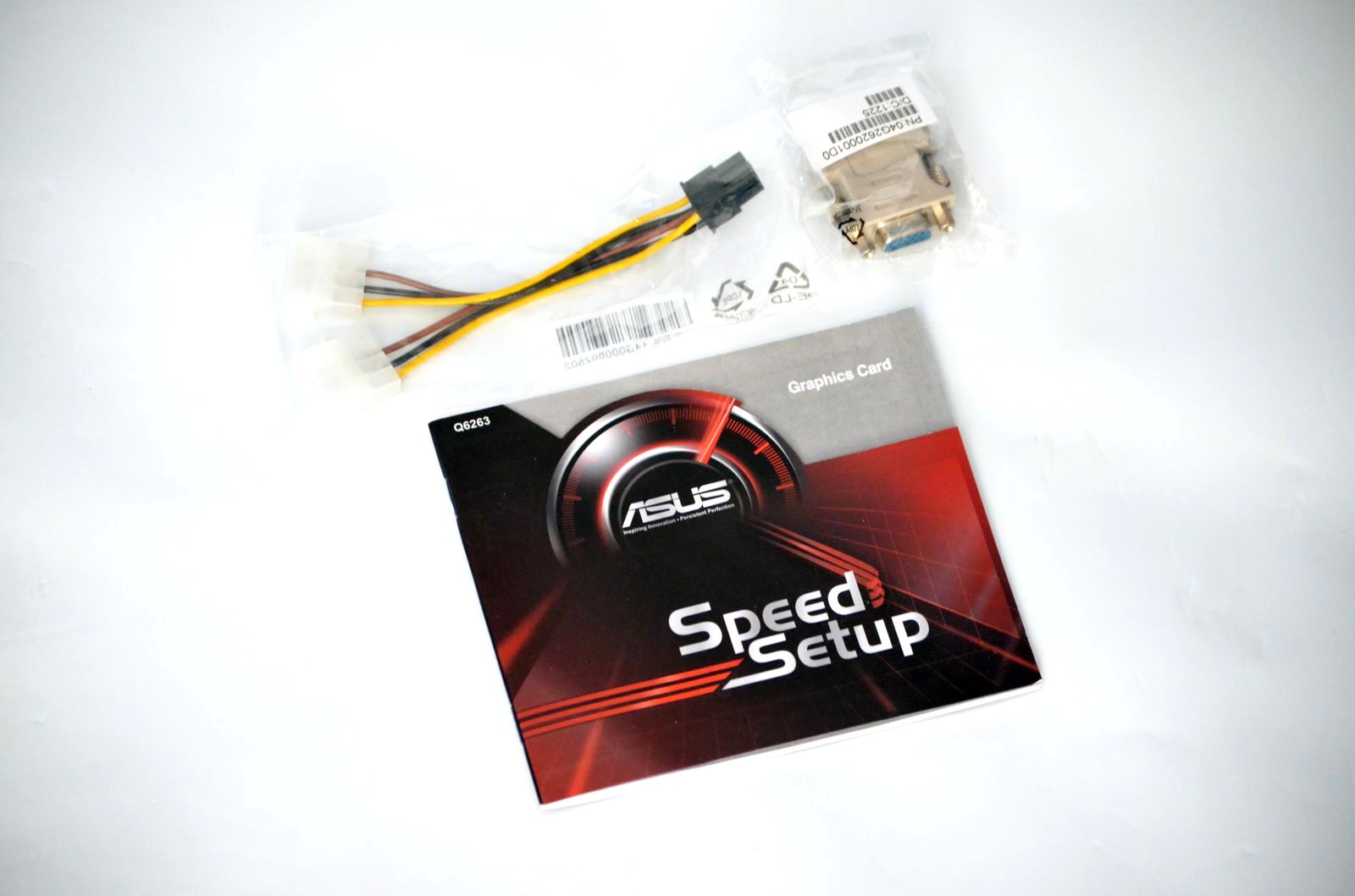 La capitolul accesorii, ASUS se dovedesc zgârciţi în acest caz, pachetul conţinând numai convertorul de semnal DVI-to-VGA, un adaptor de alimentare de la doi conectori de tip MOLEX la conector cu şase pini şi ghidul de instalare. Aţi observat probabil absenţa discului optic cu drivere. Acesta nu va lipsi în cazul exemplarelor din canalul de distribuţie, deci presupunem că absenţa sa în situaţia de faţă nu reprezintă decât o nouă măsură luată de NVIDIA pentru a reduce numărul articolelor ce ar putea apărea înainte de vreme.