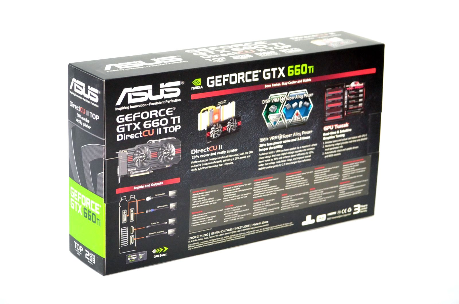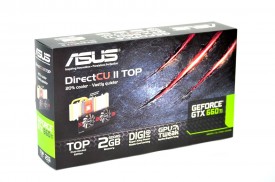Ambalajul în care este livrată GTX660 TI-DC2T-2GD5 respectă noile linii de design introduse de ASUS pentru plăcile video NVIDIA din generaţia Kepler, cu menţiunea că introducerea imaginii cu cooler-ul parcă îl face mai atractiv.
