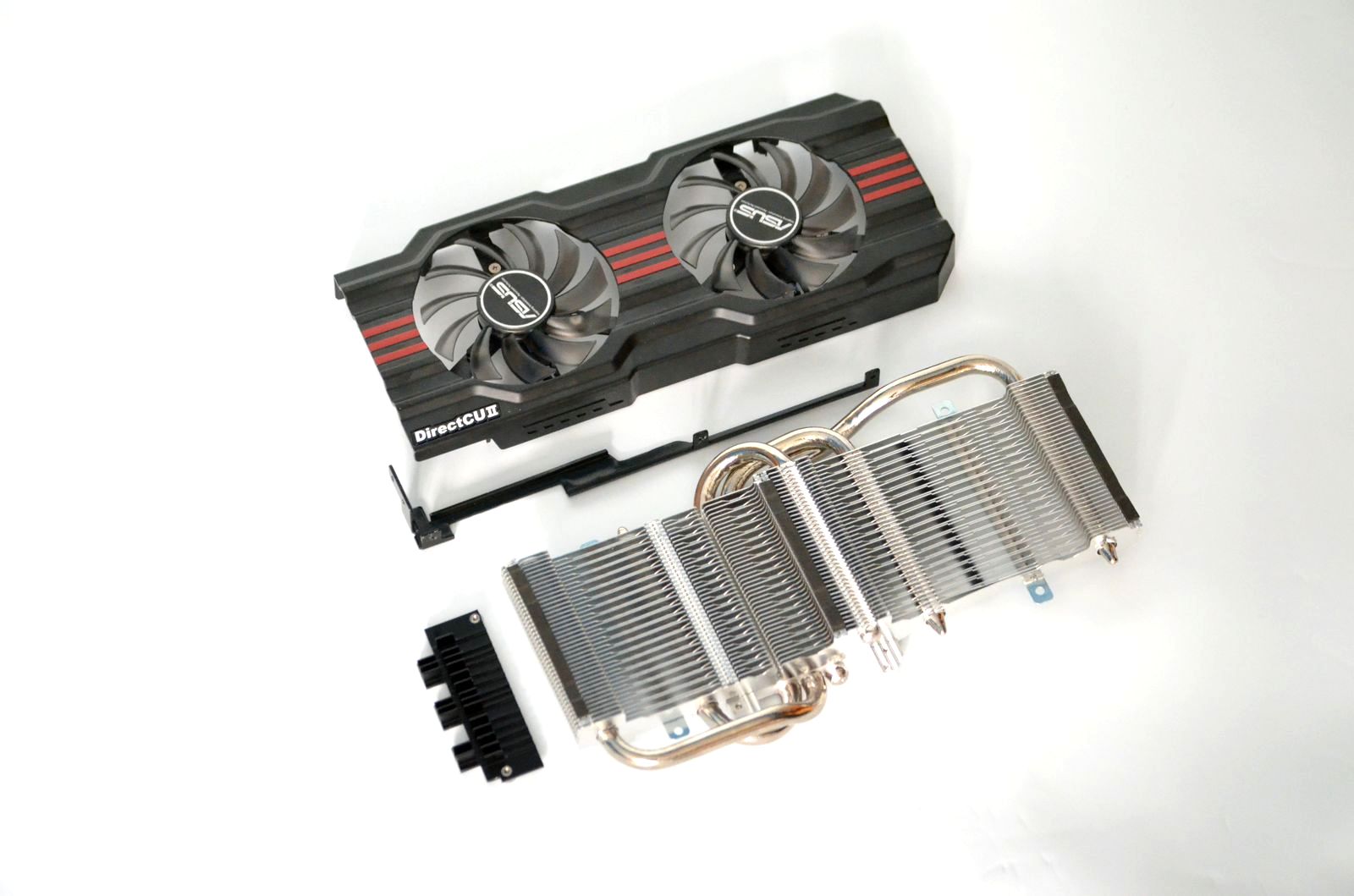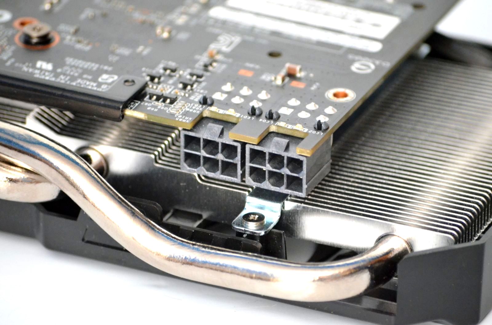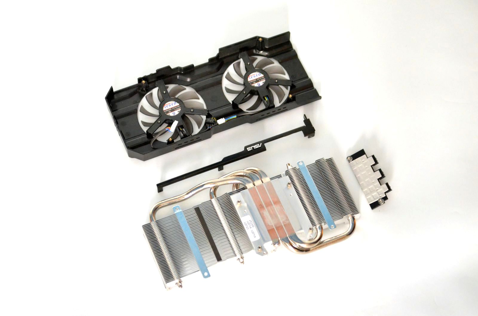 Cooler-ul are la bază un heatsink de dimensiuni impresionante, prevăzut cu trei heatpipe-uri groase de 8mm ce preiau căldura direct de pe GPU. Un al doilea heatsink, de dimensiuni mai mici, are rolul de a răci VRM-ul, iar fluxul de aer este asigurat de două ventilatoare clasice cu diametrul de 80mm montate într-o carcasă metalică.