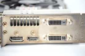 Bracket-ul dual slot este prevăzut cu doi conectori DVI (unul este DVI-D şi celălalt este DVI-I), un conector HDMI şi unul DisplayPort. Pentru alimentarea cu energie, modelul dispune de doi conectori cu şase pini.