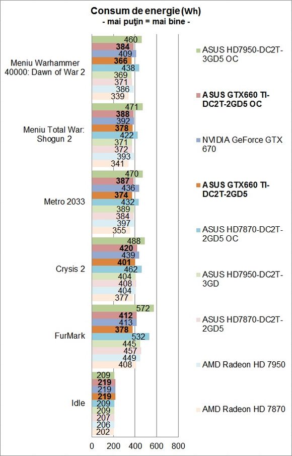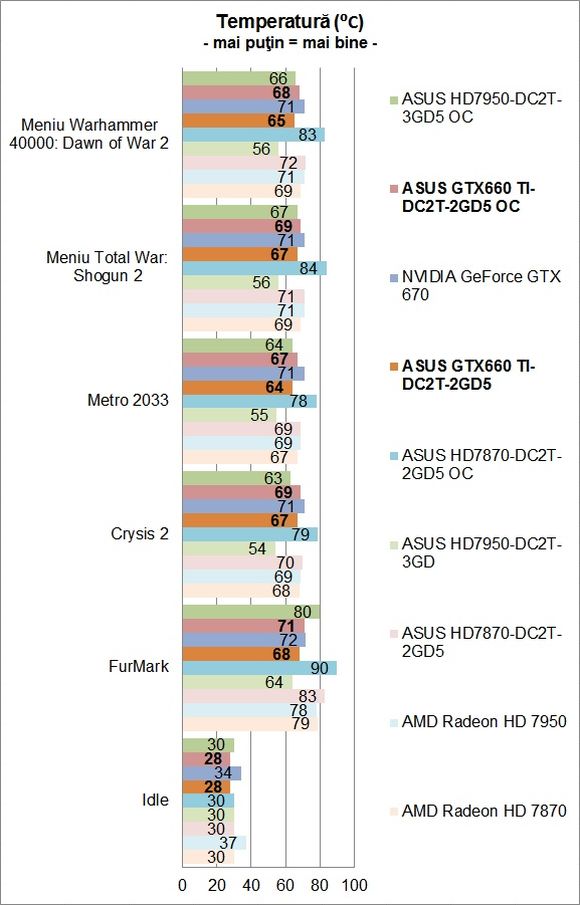La un preţ de circa 1600 Lei, ASUS GTX660 TI-DC2T-2GD5 ar fi fost o soluţie atractivă, fără a aduce totuşi modificări semnificative situaţiei actuale de pe piaţa plăcilor video. La circa 1800 Lei sau poate chiar uşor peste , ne apropiem totuşi după părerea puţin cam mult de GeForce GTX 670, care este în mod evident o soluţie superioară şi care oferă în plus şi un potenţial de overclocking mai bun.