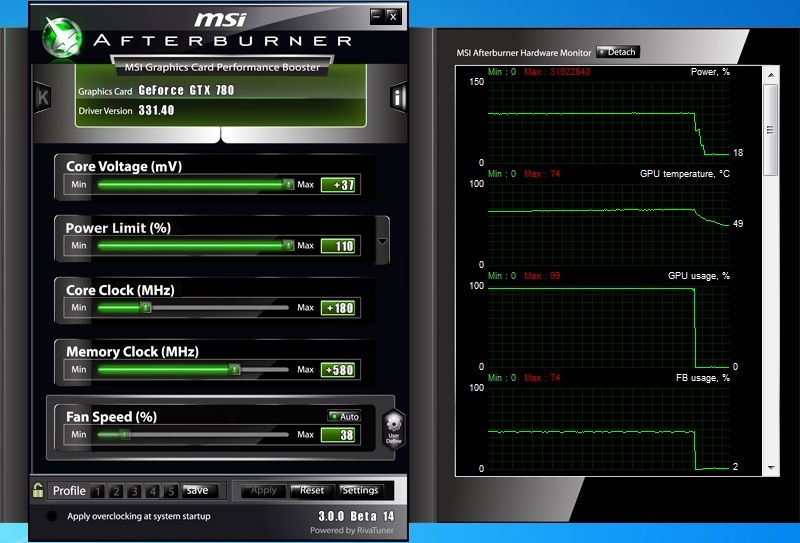 Potenţialul de overclocking nu a fost nici el uitat, iar pentru asta am folosit aplicaţia MSI Afterburner. Poate că ar fi fost mai indicat să apelez la ASUS GPU Tweak, dar din comoditate şi lipsă de timp am folosit ce aveam deja instalat.