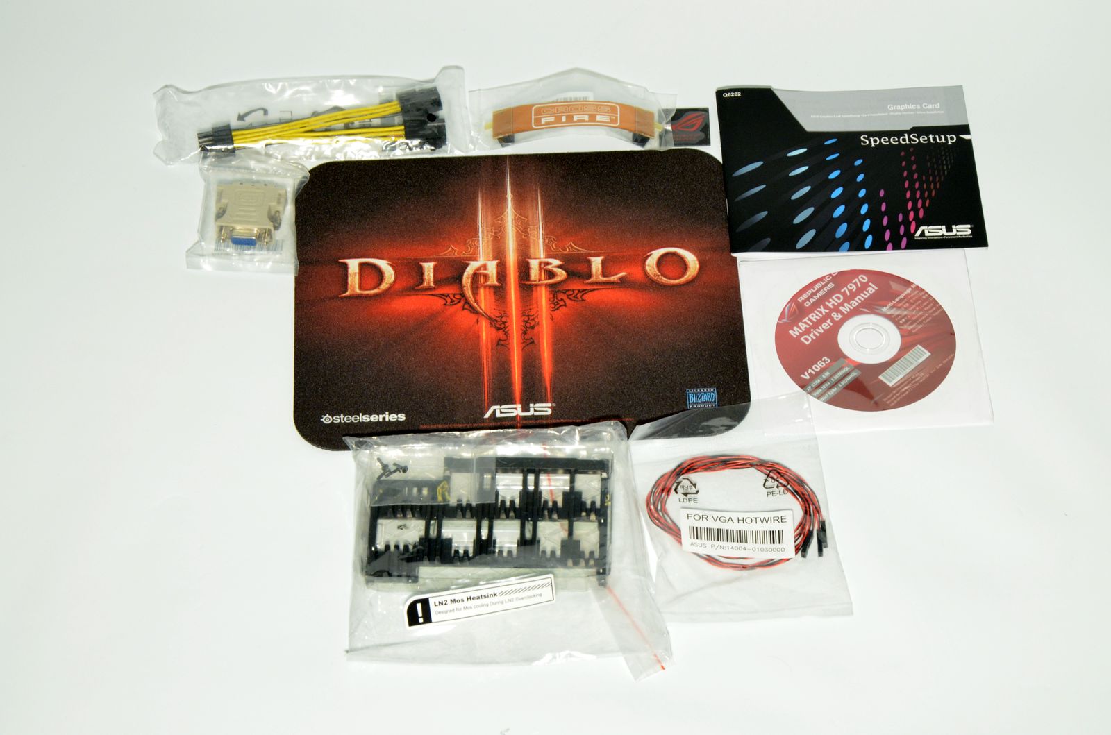 La capitolul bundle, putem spune că ASUS MATRIX-HD7970-P-3GD5 stă foarte bine, fiind acompaniată de accesorii oarecum obişnuite precum discul optic cu drivere şi aplicaţii, manualul de utilizare, bridge-ul CrossFireX, adaptorul de alimentare de la doi conectori cu 6 pini la unul cu 8 pini sau adaptorul DVI-to-VGA, dar şi de câteva accesorii mai deosebite. Astfel, găsim în pachet cablul necesar utilizării VGA Hotwire, un heatsink pentru VRM şi un mouse pad Diablo III produs de Steelseries. Heatsink-ul pentru VRM este livrat de producător pentru a fi folosit în cazul utilizării unei răciri cu LN2.