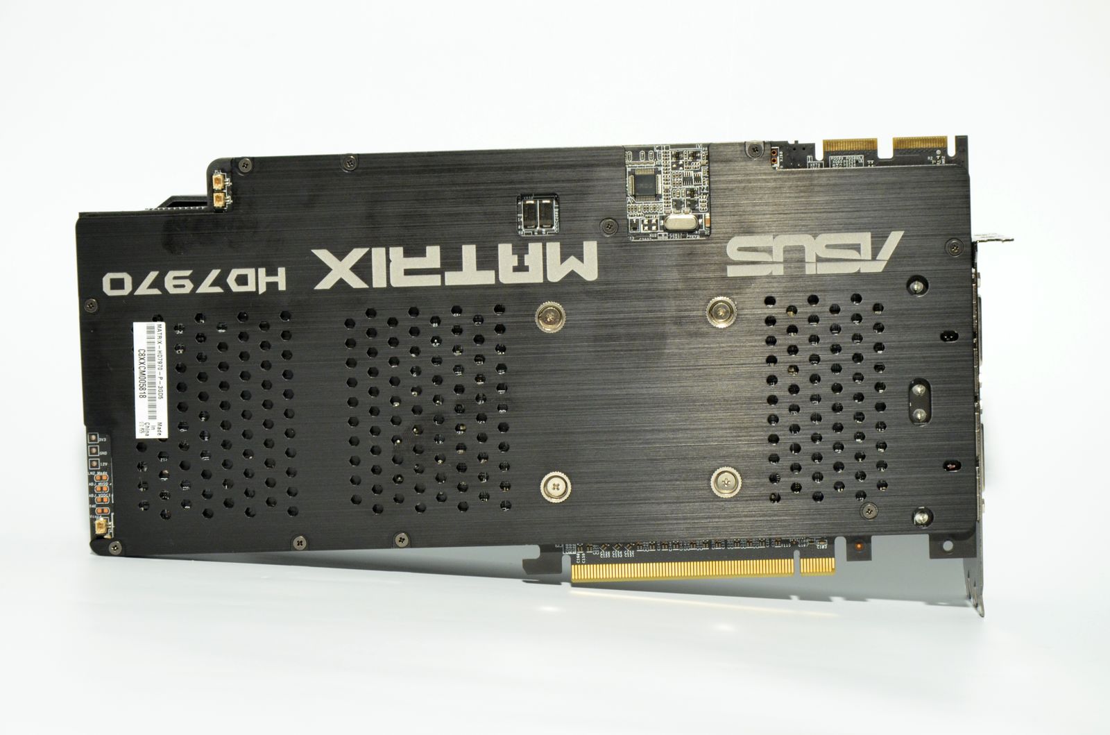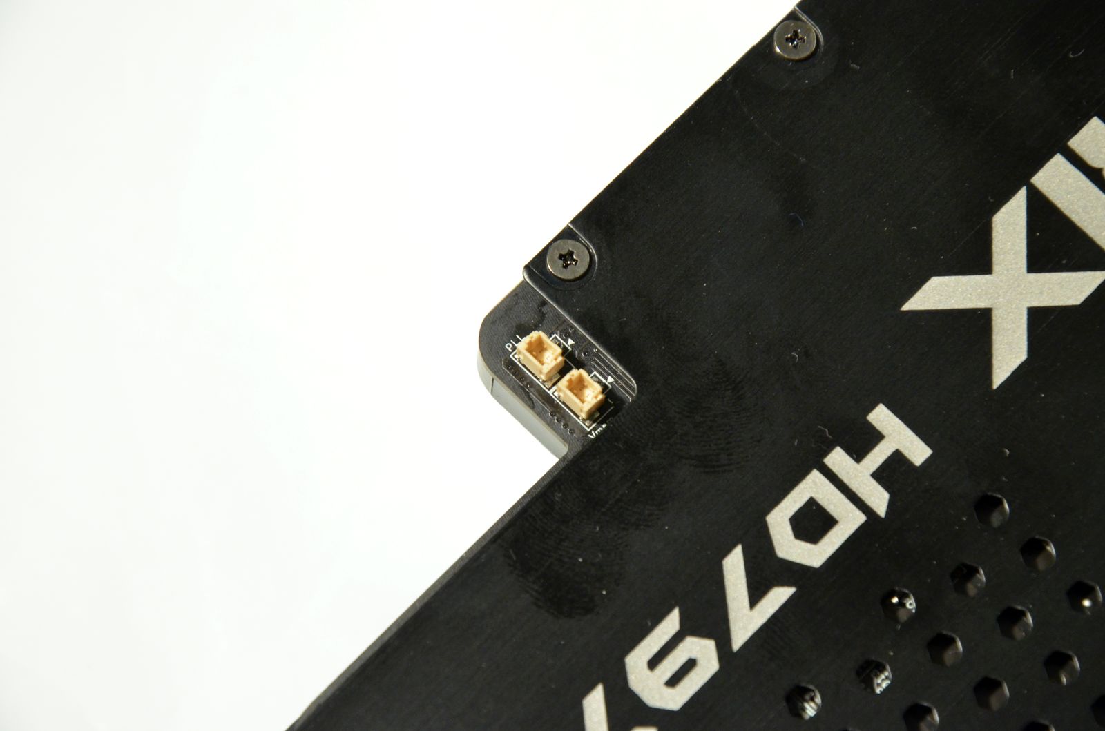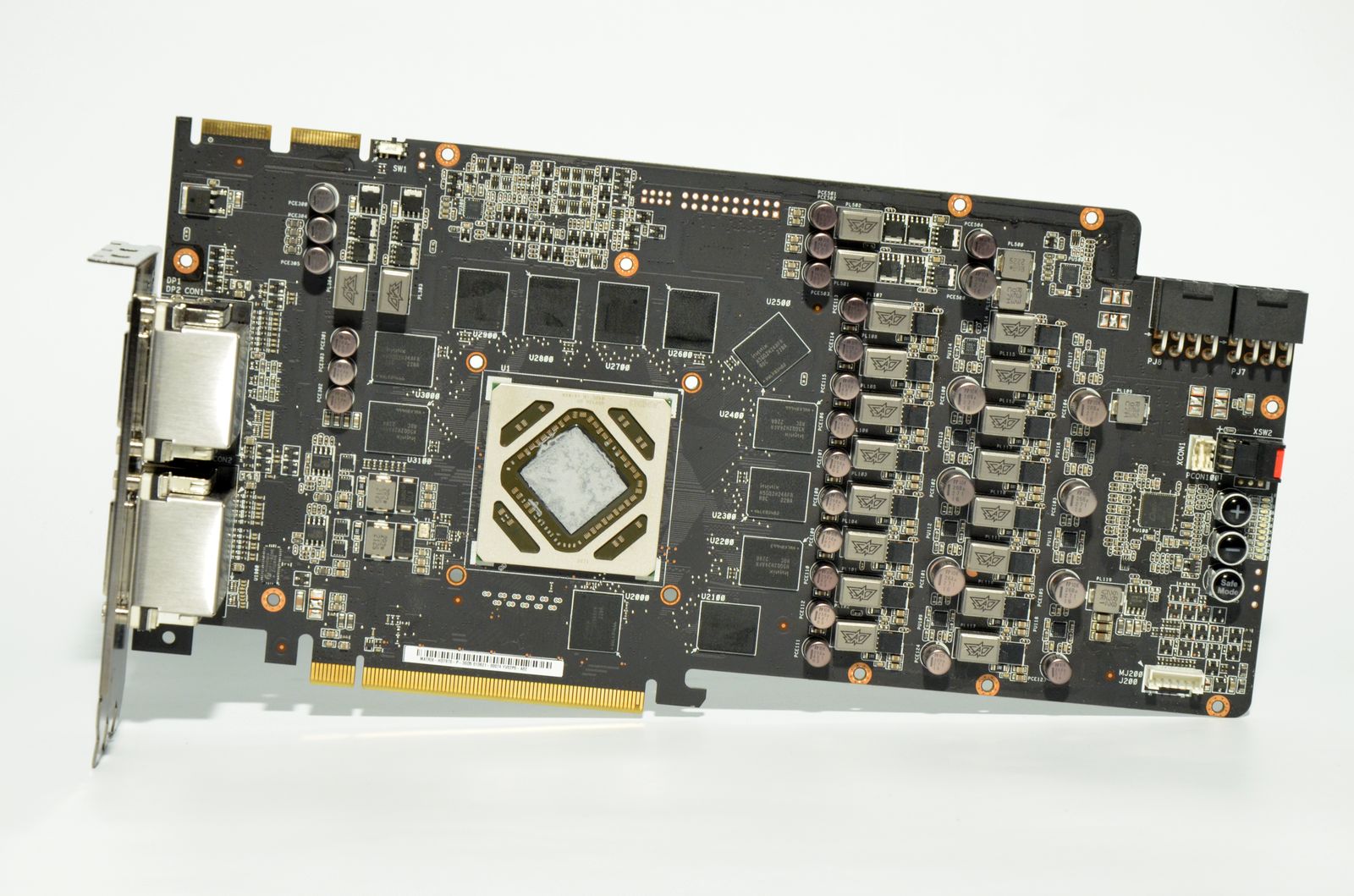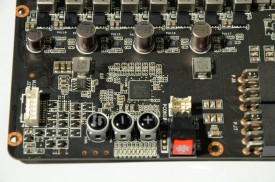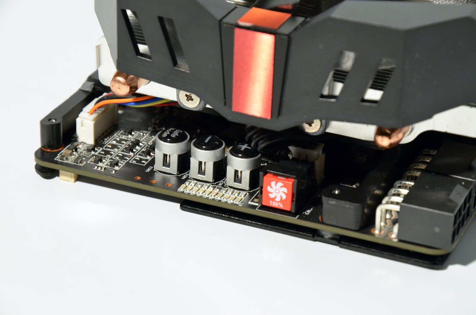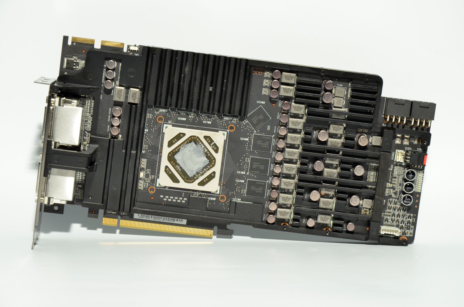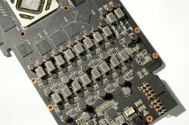 Prezenţa butoanelor TweakIt, care permit ajustarea hardware a tensiunii de alimentare, a butonului Safe Mode pentru revenirea la setările implicite şi a butonului pentru blocarea turaţiei ventilatoarelor la maximum nu reprezintă o surpriză. Se mai observă, de asemenea, pe spatele plăcii, conectorii necesari utilizării tehnologiei VGA Hotwire.