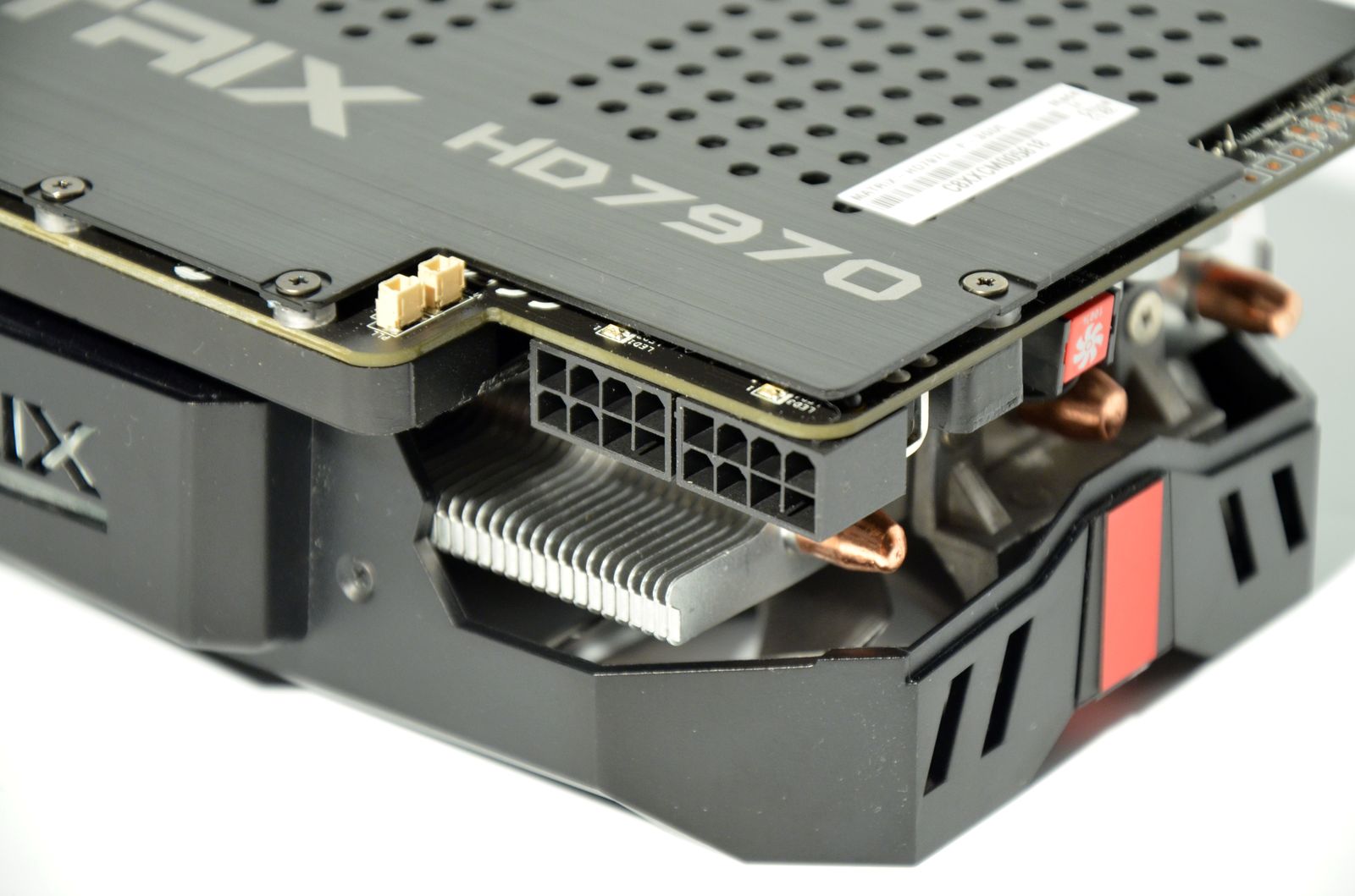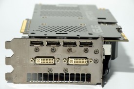 Ocupând 3 slot-uri, bracket-ul nu putea fi altfel decât generos, aşa că a fost dotat cu 2 porturi DVI-I şi cu 4 porturi HDMI. Absenţa unui port DisplayPort mi s-a părut cam ciudată, dar dacă stau să mă gândesc la cât de puţin este folosit acest conector, pot spune că parţial înţeleg decizia producătorului de a renunţa la el. Pentru alimentarea cu energie, placa foloseşte 2 conectori cu 8 pini.