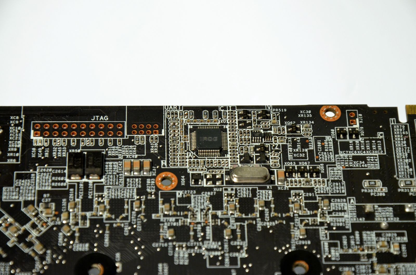Din păcate, bucuria mea legată de faptul că ASUS au decis ca de această dată să răcească şi chip-urile de memorie video a fost spulberată rapid. După înlăturarea heatsink-ului pentru GPU, am descoperit cu stupoare că numai o parte din chip-uri au fost răcite (sau parţial răcite), 4 dintre ele rămânând complet descoperite.