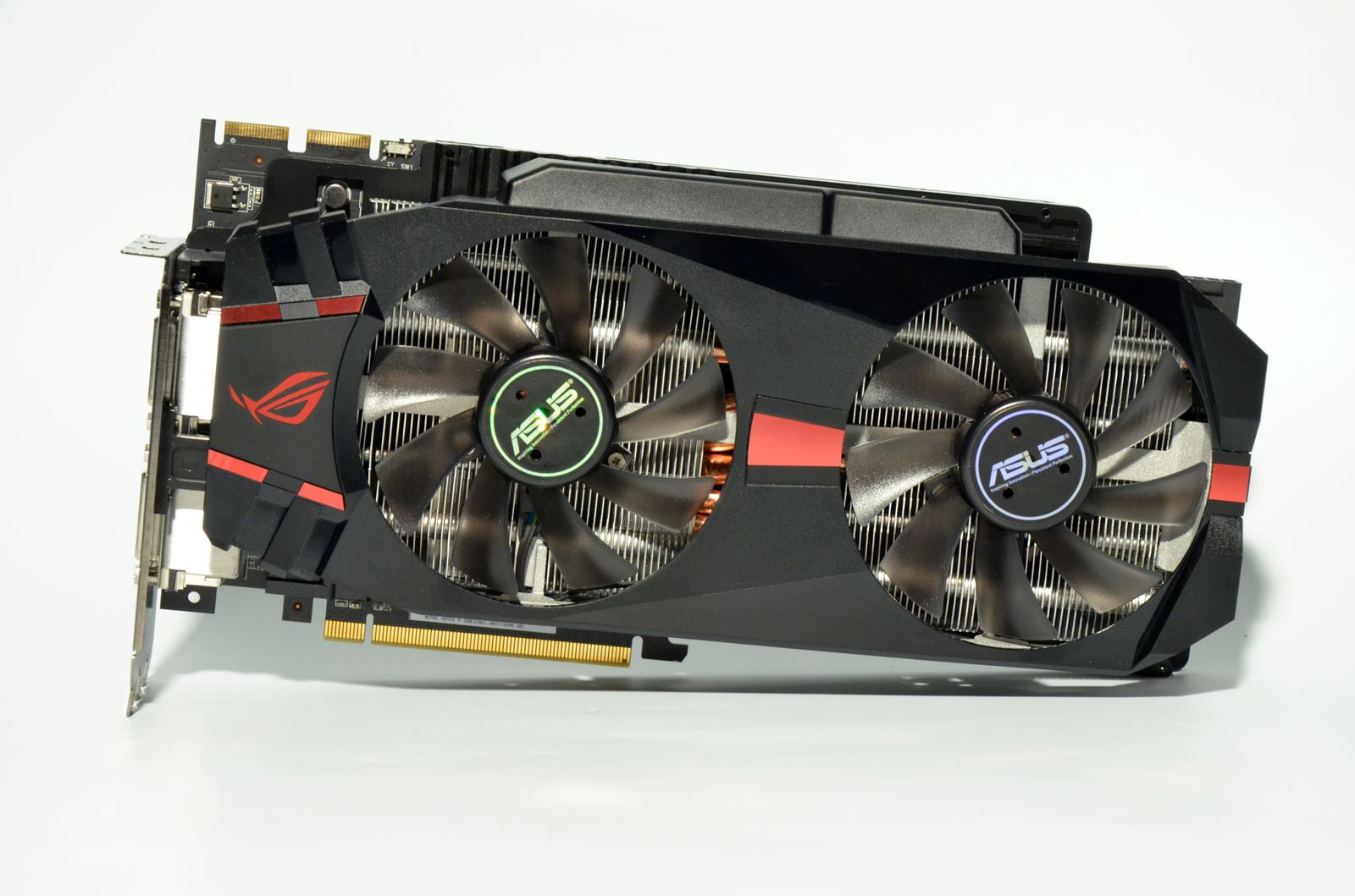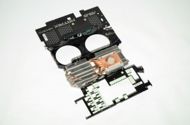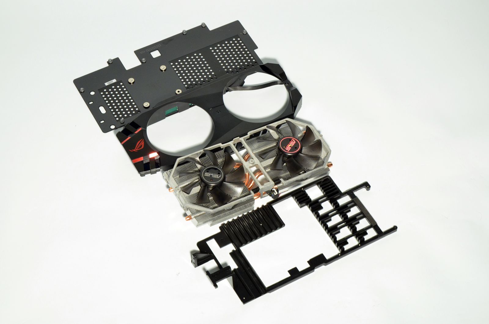Demontarea cooler-ului s-a dovedit o muncă migăloasă datorită numărului mare de şuruburi folosite pentru fixarea sa. Acesta este alcătuit dintr-un heatsink de dimensiuni impresionante, prevăzut cu 5 heatpipe-uri de 8mm şi două ventilatoare clasice de 92mm, un heatsink pentru VRM şi chip-urile de memorie video GDDR5, un heatspreader montat pe spatele PCB-ului şi o carcasă din plastic. Carcasa este prevăzută cu logo-ul ASUS MATRIX iluminat, a cărui culoare se schimbă în funcţie de nivelul de solicitare a plăcii.