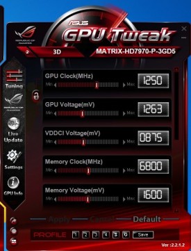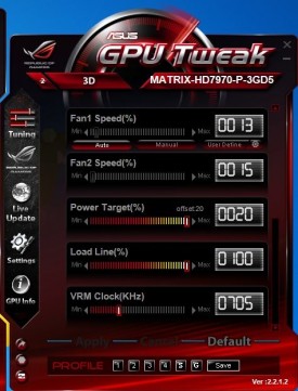 Ar trebui să mai fac aici unele menţiuni referitoare la celelalte funcţii oferite de ASUS MATRIX HD7970 Platinum pentru pasionaţii de overclocking. În primul rând, reglarea ventilatoarelor la turaţie maximă a îmbunătăţit stabilitatea la frecvenţe mai mari decât cea de 1250MHz după mărirea în prealabil a tensiunii de alimentare, dar nu a eliminat şi artefactele apărute în această situaţie. De asemenea, majorarea tensiunii de alimentare pentru chip-urile de memorie video ar fi permis obţinerea unor frecvenţe mai mari pentru acestea dar din nou ne-am fi confruntat cu artefacte. Cu alte cuvinte, funcţiile de acest gen se pot dovedi extrem de utile pentru entuziaştii care vor să depăşească anumite rezultate obţinute în diverse aplicaţii, dar nu oferă prea multe pentru utilizatorul normal. Dar, aşa cum spuneam, MATRIX nu este un produs pentru utilizatorii normali, ci este un produs realizat pentru maniaci.