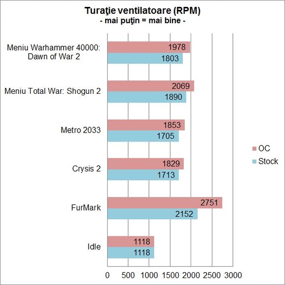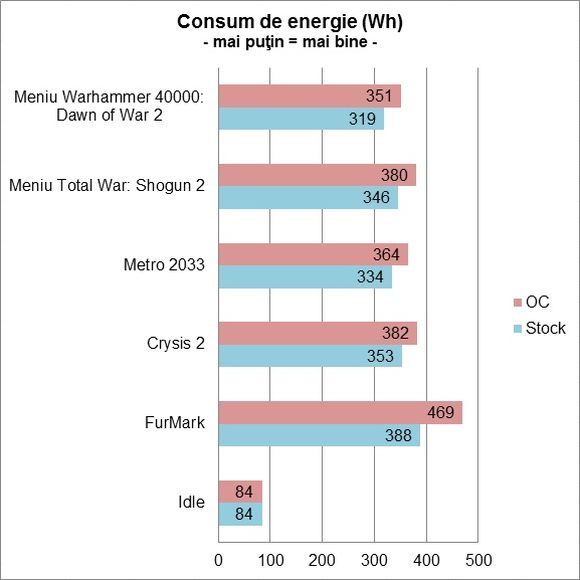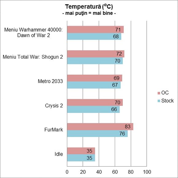 Dacă până acum ASUS MATRIX-HD7970-P-3GD5 a eşuat în a vă impresiona, acum ar cam fi cazul să o facă. Temperaturile de funcţionare sunt mici, fie că vorbim despre frecvenţele implicite, fie că ne referim la cele utilizate pentru overclocking. De asemenea, zgomotul este cu mult mai mic decât mă aşteptam. De fapt, singurul caz în care acesta a atins un nivel deranjant a fost la overclocking, când am rulat FurMark. În rest, placa s-a dovedit silenţioasă, indiferent de frecvenţele folosite sau de aplicaţia rulată.