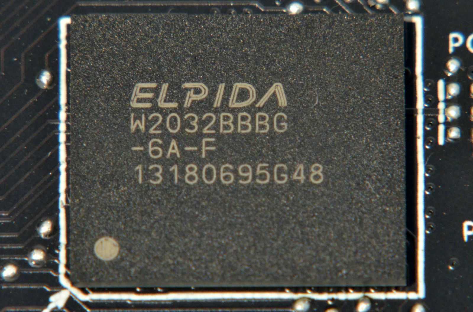 Chip-urile de memorie sunt Elpida W2032BBBG-6A-F, iar pentru alimentarea cu energie a celor 2 ventilatoare a fost implementat un conector cu 5 pini.