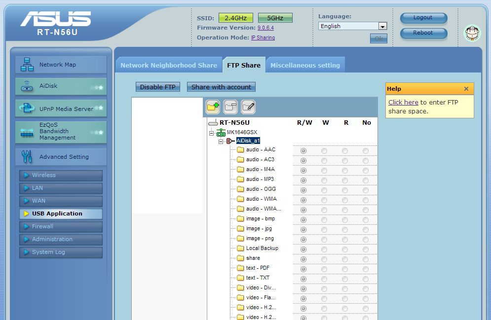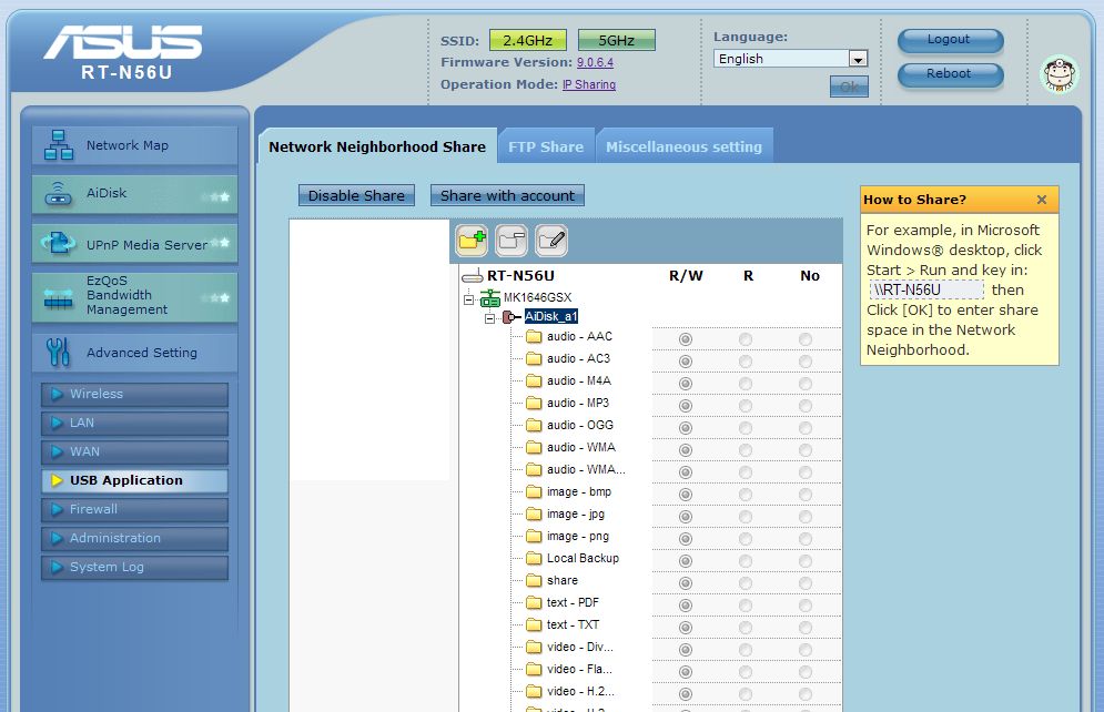 Prima, si cea mai des utilizată, este funcția de partajare a unui disc în reţea. Meniul USB Applications permite maparea unui disc, formatat FAT32 sau NTFS şi conectat la unul din cele două porturi USB, astfel încât capacitatea lui de stocare să fie disponibilă oricui. În mod implicit, accesul via SMB este liber, dar în cazul in care este nevoie, utilizatorul poate proteja directoarele creând nume de utilizatori şi parole şi aplicarea unor reguli de acces (Scriere/citire, doar citire şi fără acces).