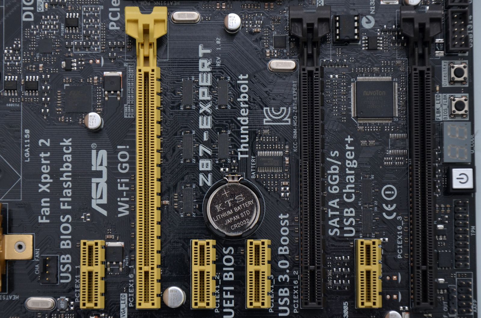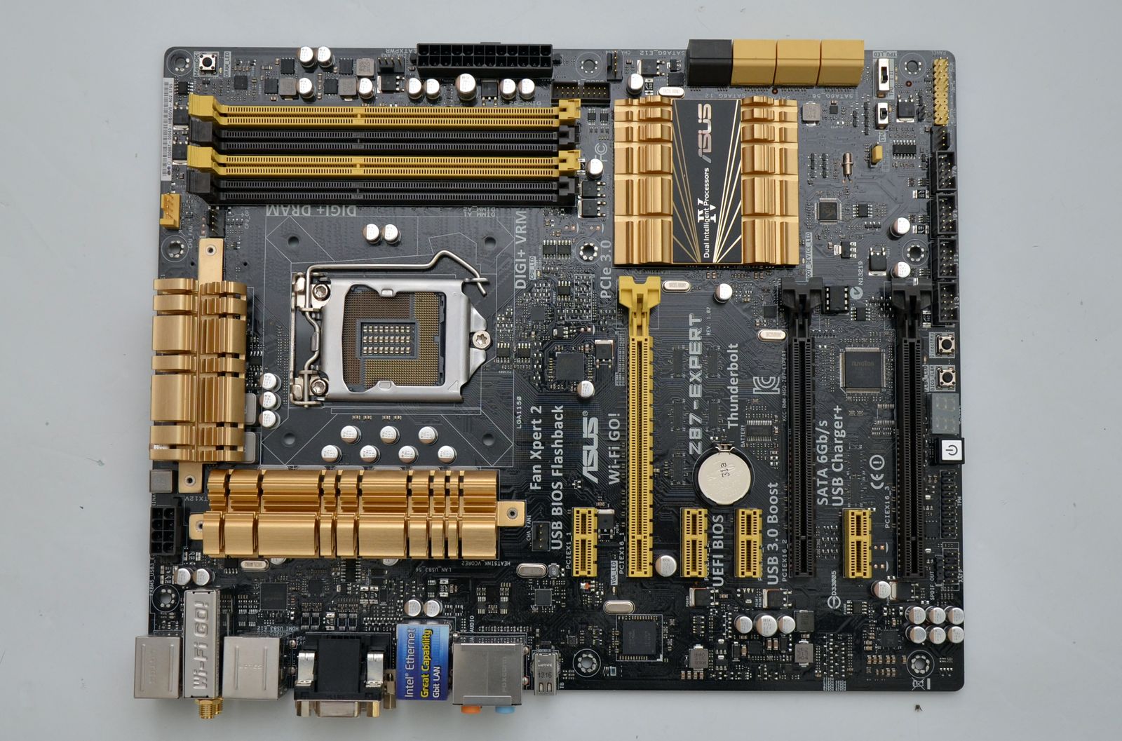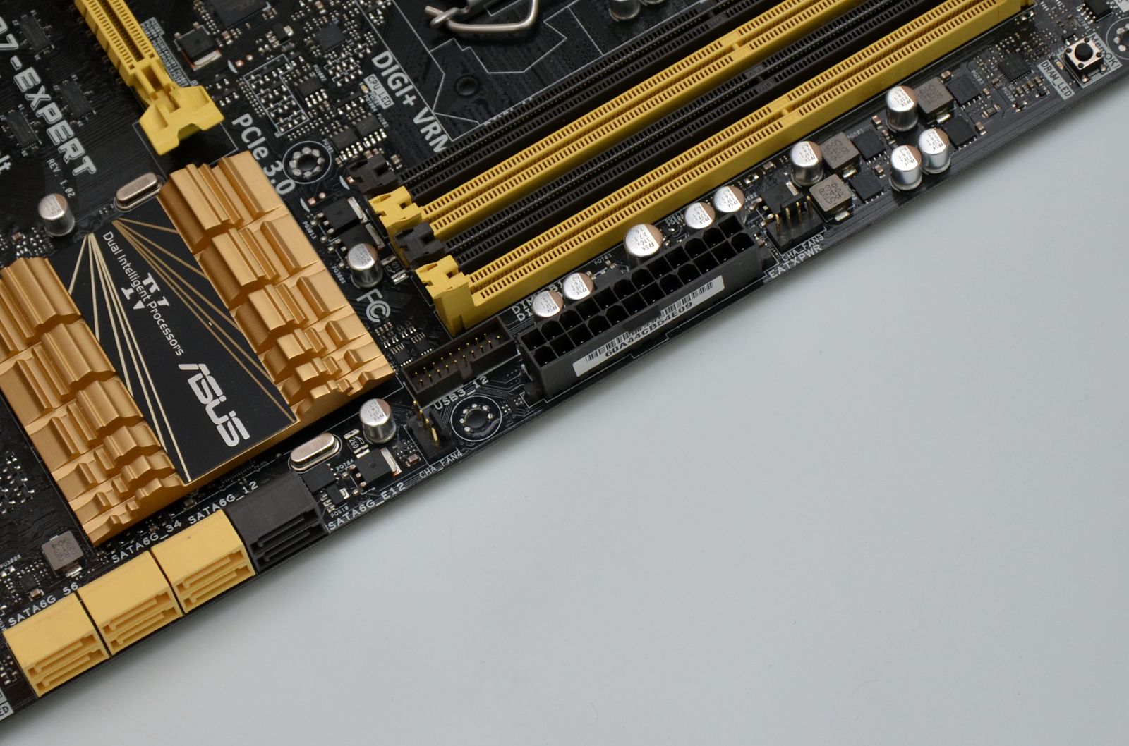 ASUS Z87-EXPERT seamănă uşor cu Z87-DELUXE mulţumită utilizării aceleiaşi scheme de culori. Se observă însă o reducere a complexităţii PCB-ului, ceea ce este perfect normal dacă ţinem cont de faptul că este plasată într-un segment de preţ ceva mai jos.