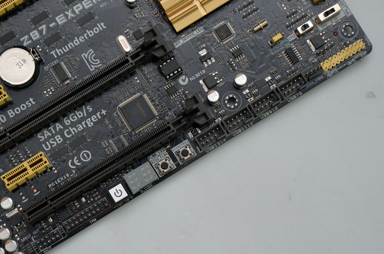 Conectivitatea back panel-ului prezentată anterior este completată de o serie de headere dispuse pe marginile PCB-ului. Tot aici se pot observa şi cele 8 porturi SATA 6.0Gbps, dar şi butoanele Power, BIOS Flashback, DirectKeyşi MemOK. Indicatorul LED pentru debugging se va dovedi util în anumite situaţii, iar selectoarele EPU şi TPU garantează un acces rapid şi uşor la reducerea consumului de energie sau la îmbunătăţirea performanţelor prin supratactare.