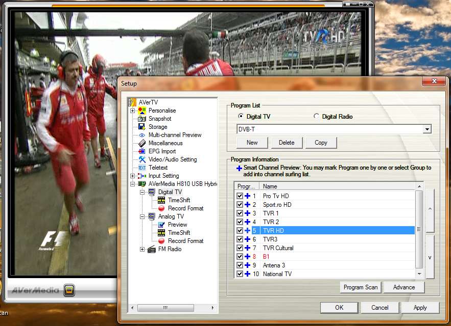 Pe CD-ul cu software găsim drivere pentru instalare și aplicaţia AverTV 6, responsabilă de configurarea funcțiilor TV. Odată conectat la unul din port-urile USB disponibile, instalarea driverelor pentru reciver-ul GPS și cel TV sunt realizate din câteva click-uri, după care suntem întâmpinați cu meniul Setup al aplicației AverTV 6. După selectarea țării de origine și tipul transmisiunii dorite (analogică sau DVB-T), trecem la scanarea programelor disponibile. Acest proces nu durează mai mult de câteva minute, dar necesită poziționarea antenei într-un loc favorabil recepției a cât mai multe canale, în caz contrar trebuind repetat procesul de scanare. Din fericire antena DVB-T și-a făcut bine datoria, toate programele disponibile fiind detectate din prima încercare. Totuşi pentru o recepţie fără întreruperi este bine să nu ne îndepărtăm prea mult de ferestrele încăperii.