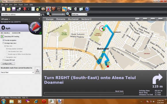 Pentru testarea funcţionalităţii GPS am apelat la aplicaţia Microsoft AutoRoute, în versiune cu modul de localizare GPS.
