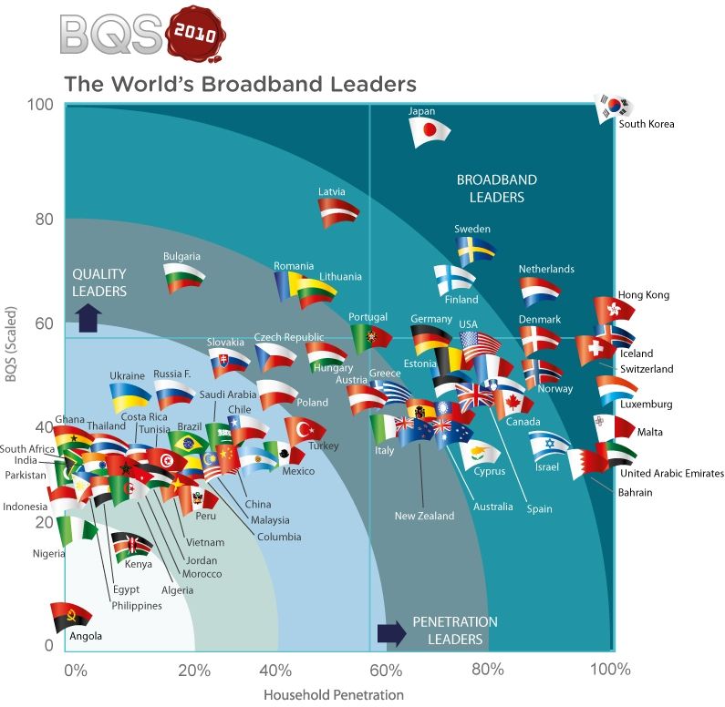 Clasamentul liderilor calității conexiunilor broadband cuprinde, în ordine, Coreea de Sud, Hong Kong, Japonia, Islanda, Elveţia, Luxemburg, Singapore, Malta, Olanda, Emiratele Arabe Unite, Qatar, Suedia şi Danemarca. Dintre acestea, Hong Kong, Islanda, Coreea de Sud, Luxemburg şi Malta conduc în topul penetrării conexiunilor broadband cu aproape 100% dintre gospodării, faţă de grosul plutonului, a cărei medie arata că 49% dintre gospodăriile din toate ţările studiate au acces la conexiuni broadband, oricum în creştere de la 40% în 2008 şi 47% în 2009.