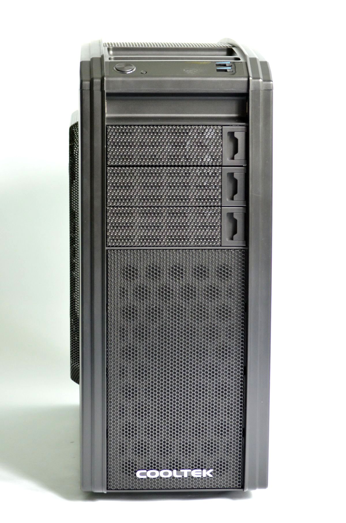 Privită din faţă, Cooltek Skiron are un aspect cât se poate de sobru, care a reuşit să mă cucerească de când am scos-o din cutie. Se observă suprafaţa perforată pentru a permite pătrunderea aerului rece, dar şi cele trei capace de la bay-urile de 5.25”, uşor detaşabile mulţumită mecanismului special cu care sunt prevăzute.