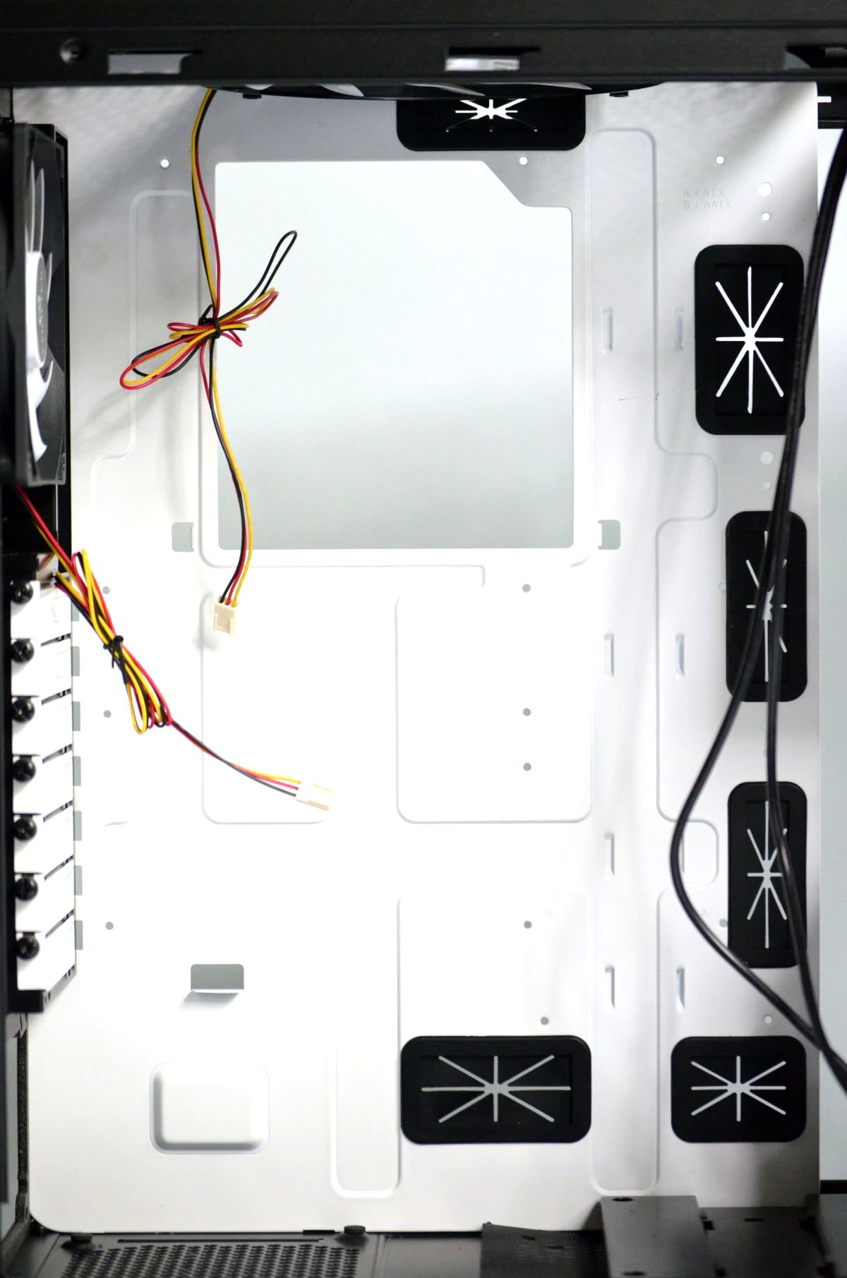 Tray-ul pentru placa de bază, alb şi el, prezintă o serie de decupaje pentru diverse fire şi cabluri, dar şi un decupaj care asigură montarea/demontarea mai uşoară a cooler-ului de pe procesor.