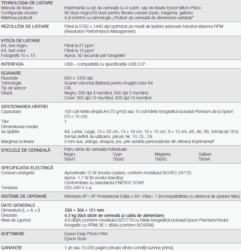 Dar mai întâi să vedem ce informaţii furnizează producătorul despre L200. Rezoluţia de tipărire oferită este de cel mult 5760x1440dpi, disponibilă numai pentru anumite medii de listare (fotografii), mulţumită tehnologiei Resolution Performance Management. În ceea ce priveşte performanţele de printare, Epson susţine că L200 poate tipări până la 27 pagini pe minut în cazul documentelor text monocrom şi până la 15 pagini pe minut în cazul documentelor text color. De asemenea, tipărirea unei fotografii 10×15 necesită teoretic circa 92 secunde.