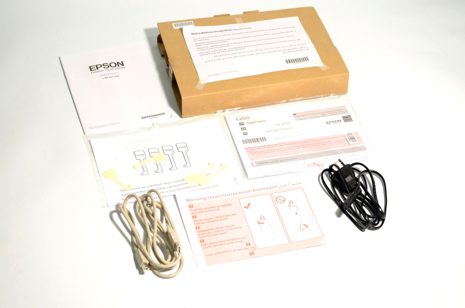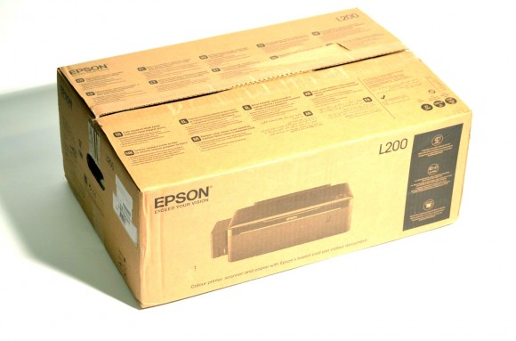 Epson L200 este livrat într-un ambalaj modest, realizat din carton simplu, fără informaţii suplimentare despre produs sau un design care să ne atragă atenţia.