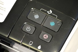 Un al doilea capac de acces este amplasat în faţă, chiar deasupra panoului de control. Şi dacă tot am pomenit de panoul de control, trebuie să ştiţi că acesta este cât se poate de rudimentar, fiind alcătuit din butoanele Power, Stop şi Copy, plus trei LED-uri care să comunice utilizatorului informaţii simple despre echipament.