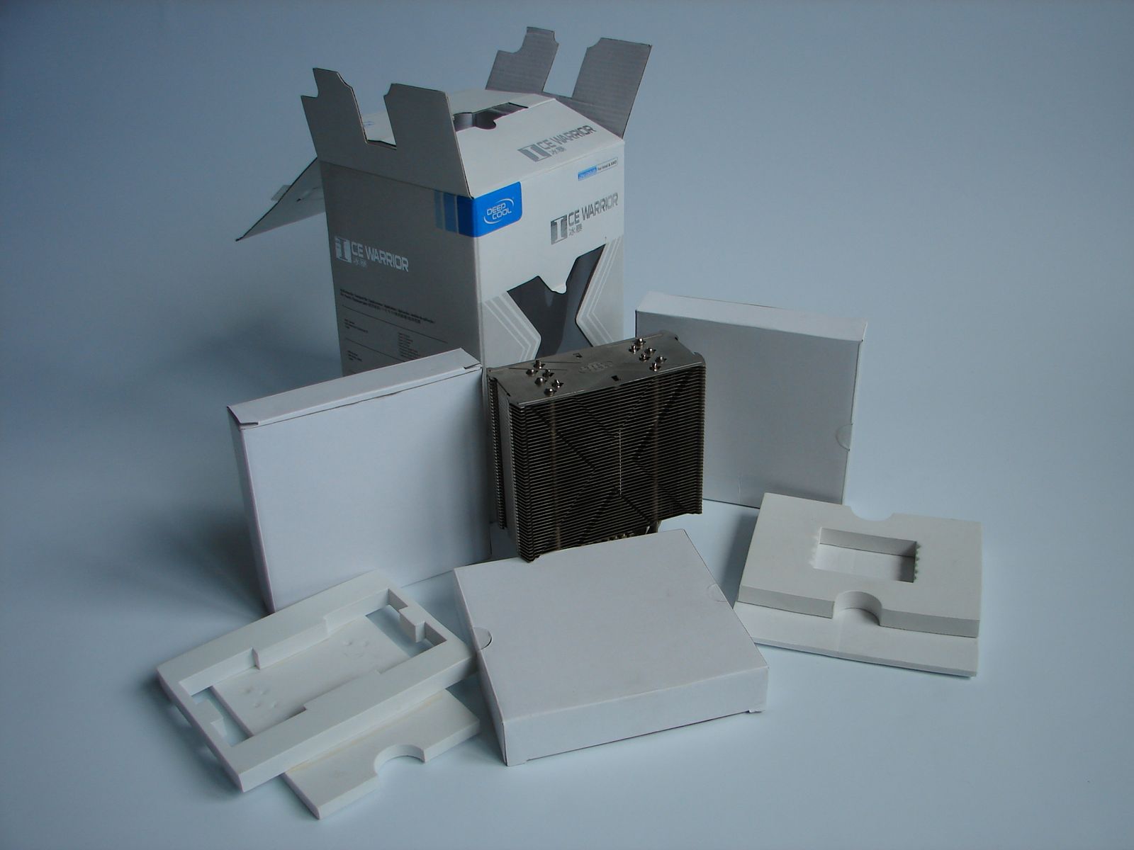 După cum se poate observa, ambalarea este făcută minuţios, heatsink-ul fiind încadrat de două suprafeţe moi, pentru a-l proteja. În plus, accesoriile sunt livrate în trei cutii destul de plate de carton, identice ca dimensiuni, ce au şi rolul de a umple spaţiile goale din ambalaj. Oricât de complicată ar părea această ambalare, ea s-a dovedit de fapt foarte practică, astfel că punerea componentelor înapoi în cutie s-a realizat fără bătăi de cap, din prima încercare.