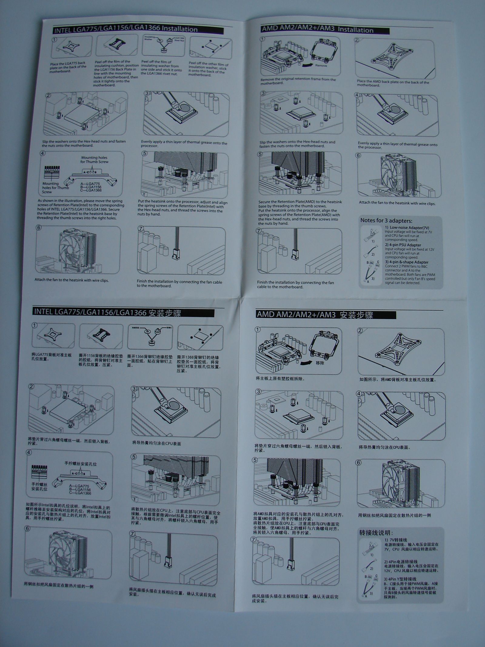 În cutie mai sunt prezente back plate-uri din plastic pentru platformele AM2/AM3, LGA 775 şi LGA 1156, piuliţe pentru platforma LGA 1366, şaibe izolatoare, două seturi de cleme de retenţie (unul compatibil cu toate platformele Intel şi unul pentru platformele AMD), piuliţe cu cap hexagonal şi două şuruburi pentru ataşarea clemelor de retenţie la heatsink. În sfârşit, nu trebuie să uit nici de pasta termoconductoare sau de ghidul de instalare.