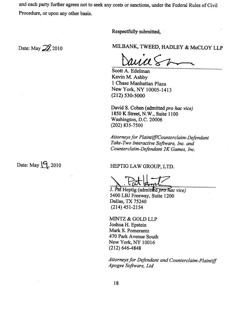 Toată încrengătura juridică s-a rezolvat luna trecută, după cum dovedeşte şi imaginea hotărârii judecătoreşti, dar alte detalii nu au fost făcute publice. Acţiunea a fost respinsă cu prejudiciu, cele două părţi încheind un acord pe 14 mai 2010. “Cu prejudiciu” înseamnă, conform legii americane, că niciuna dintre companii nu mai poate intenta vreodată proces pe această temă.