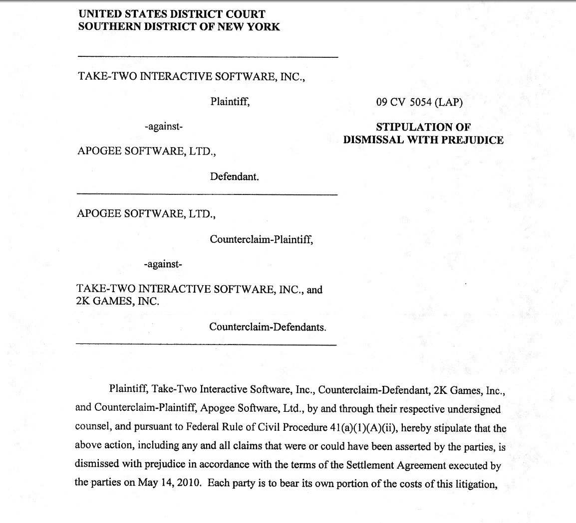 Anul trecut pe vremea asta, după ce l-au plimbat pe bietul Duke vreo 10 ani prin tot felul de idei, poveşti şi motoare grafice, 3D Realms/Apogee si Take-Two l-au dus şi la tribunal. Take-Two dădea în judecată producătorul pentru că îşi concediase toţi angajaţii fără să livreze şi jocul la care lucrau, în speţă Duke Nukem Forever. Peste o lună, şi 3D Realms deschidea proces, acuzând Take-Two că face alt joc cu Duke deşi nu au drepturile de autor pentru asta.
