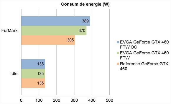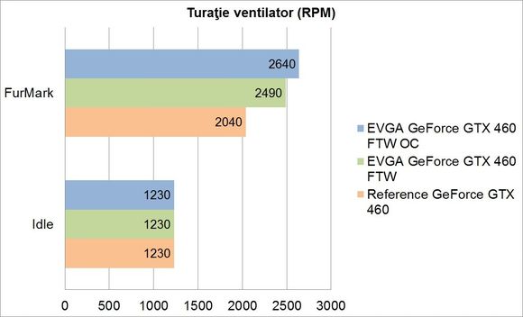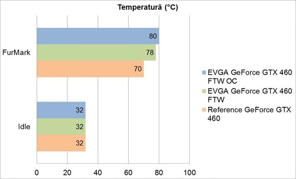 Datorită folosirii aceloraşi frecvenţe şi tensiuni de alimentare în modul 2D pentru toate cele trei ipostaze, nu se observă nicio modificare de temperatură sau consum de energie atunci când placa este idle. În urma aplicării frecvenţelor şi tensiunii de alimentare recomandate de EVGA, se observă o creştere a temperaturii cu aproape 11.5%, ceea ce cu siguranţă nu va deranja pe nimeni datorită sporului mediu de performanţă în jocuri de aproape 22%. Acest spor de performanţă obţinut este aproape egal cu creşterea consumului de energie în FurMark, care a fost de 21.3 procente. Turaţia ventilatorului în sarcină a crescut şi ea cu 22%, de la 2490RPM la 2640RPM. Trebuie menţionat însă că nivelul de zgomot nu a fost deranjant, şansele ca un utilizator antrenat într-un joc de acţiune să îl perceapă fiind minime.