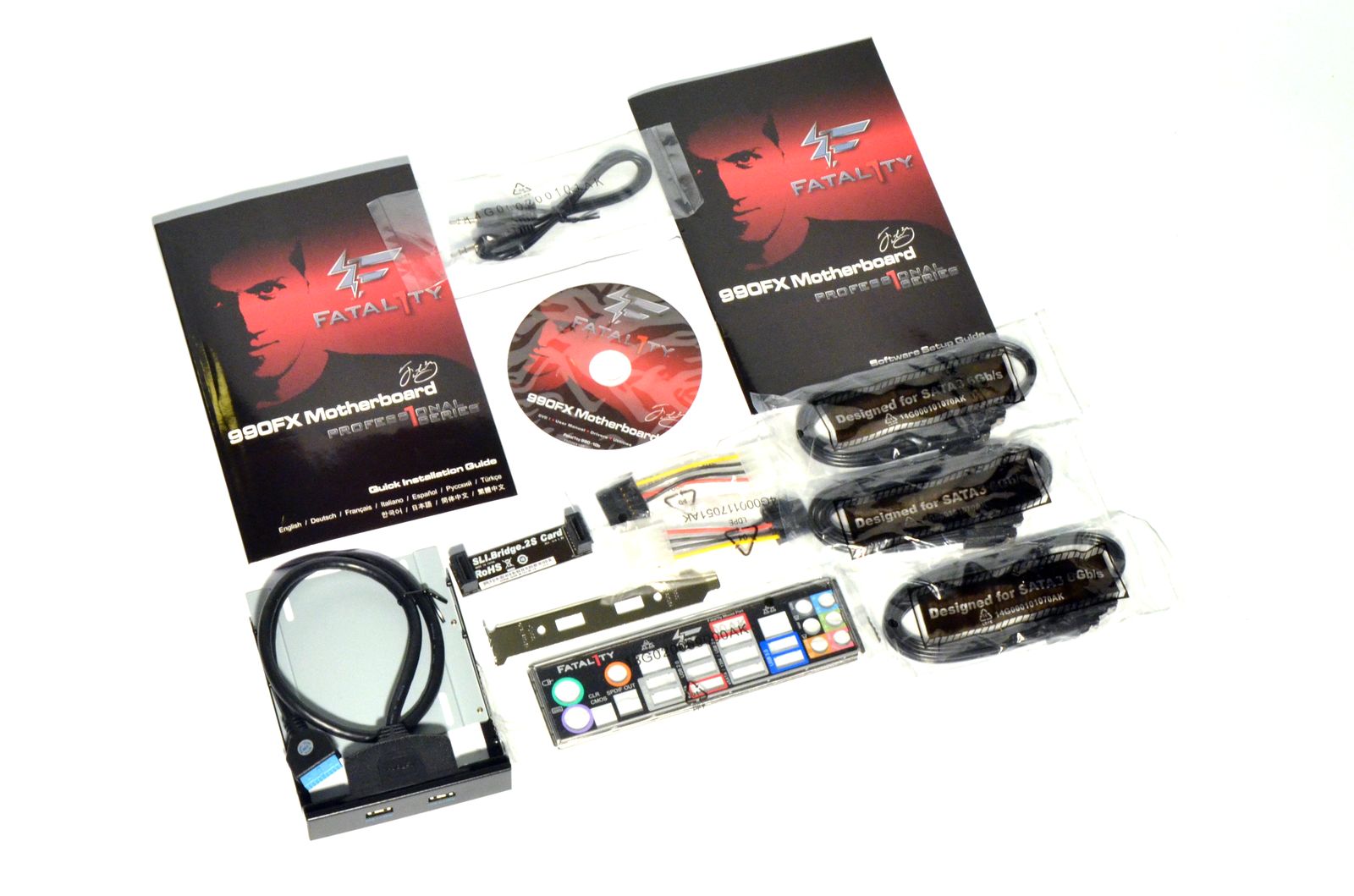 La capitolul bundle, m-aş fi aşteptat ca ASRock Fatal1ty 990FX Professional să impresioneze, dar producătorul a decis să se limiteze la accesoriile obişnuite: manualele de utilizare, discul optic cu drivere si aplicaţii, un cablu audio, un bridge SLI, 6 cabluri SATA, 2 adaptoare de alimentare SATA, shield-ul pentru back panel şi un bracket USB 3.0 ce poate fi montat atât în partea din spate, cât şi în partea din faţă a carcasei.