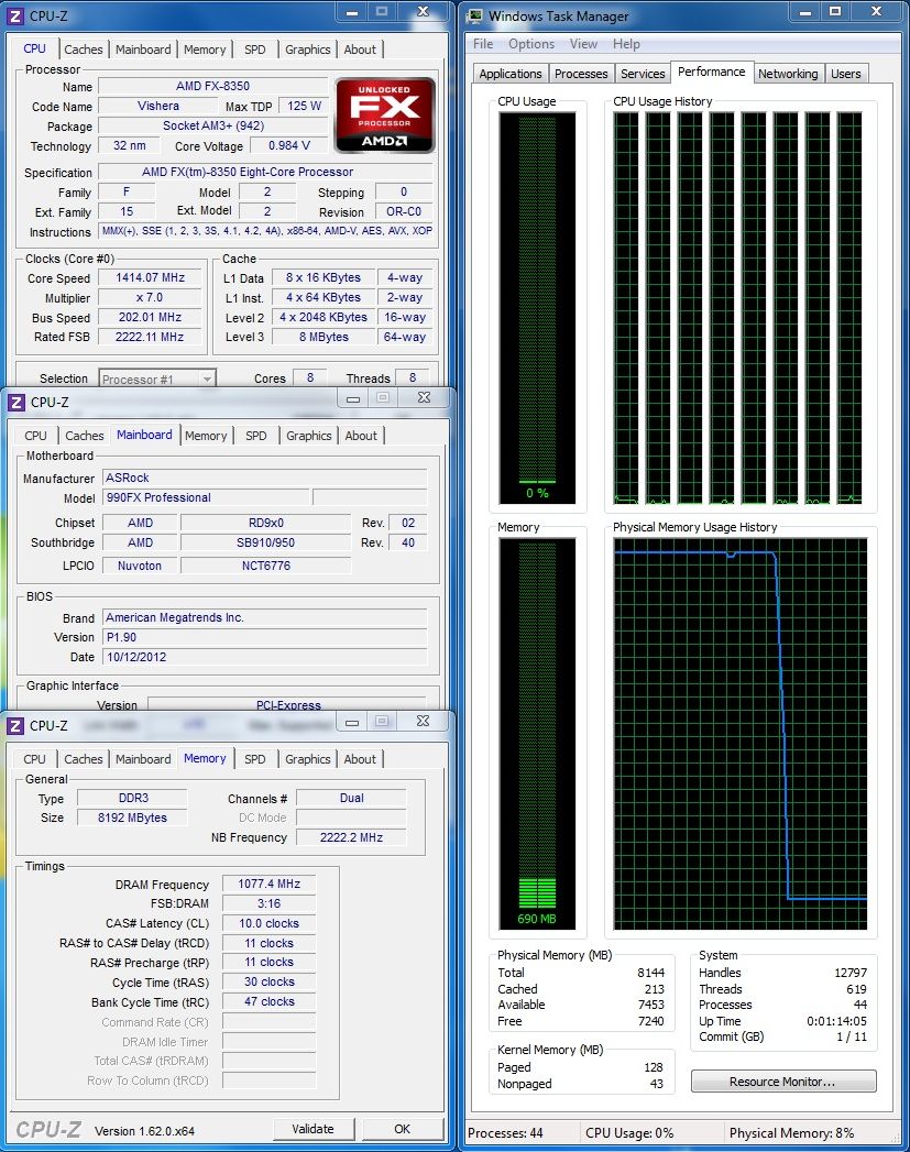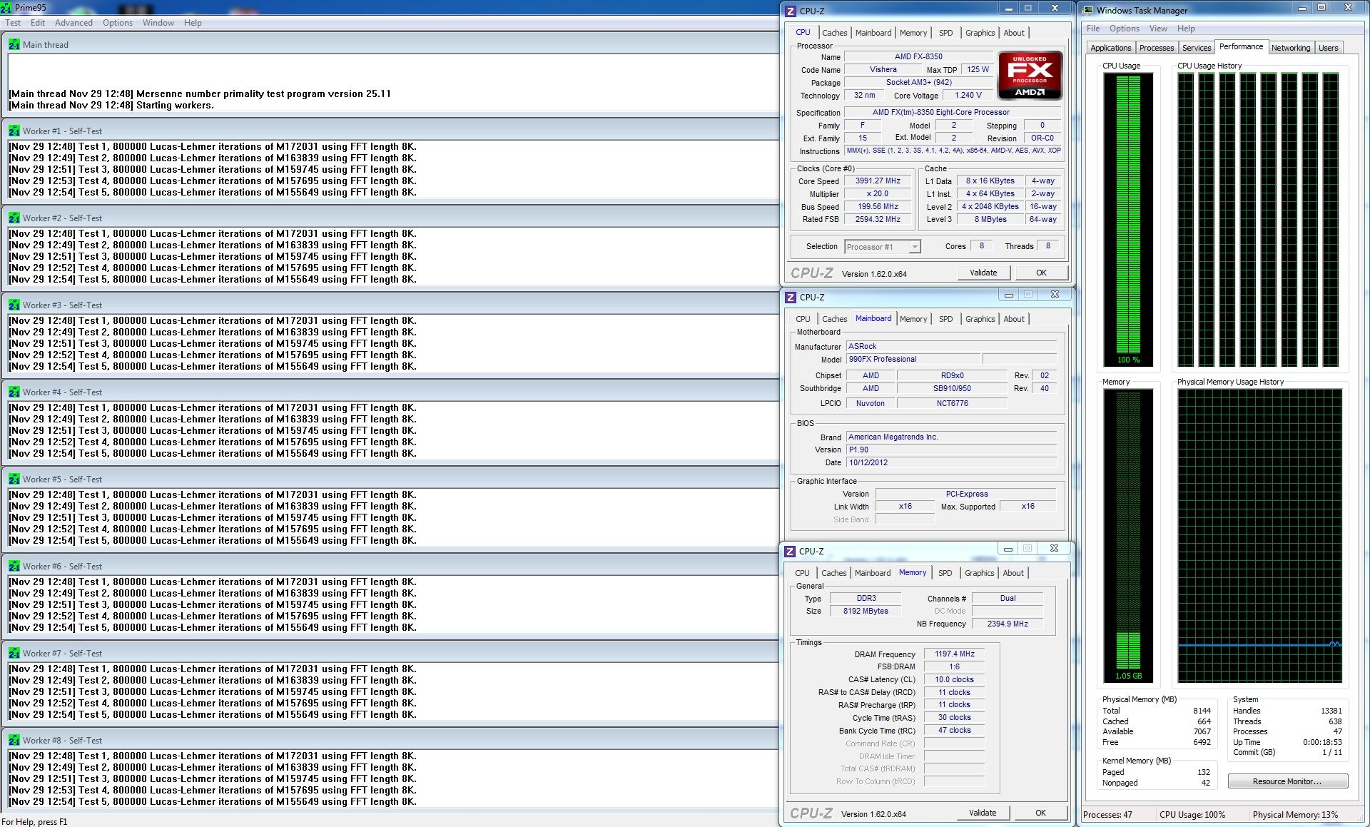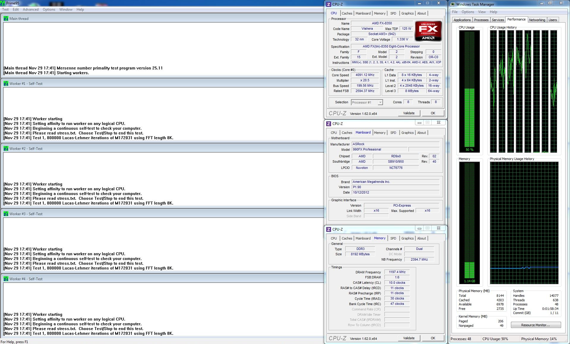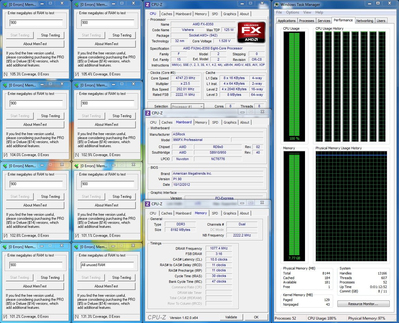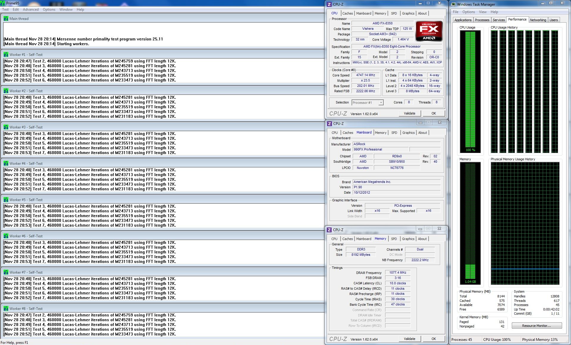 Din păcate, potenţialul de overclocking oferit nu s-a ridicat la aşteptările mele. După frecvenţa de 4.8GHz obţinută de FX-8350 la lansare, mă aşteptam să obţin cel puţin tot atât. ASRock Fatal1ty 990FX Professional nu a permis însă obţinerea unei frecvenţe mai mari de 4747MHz, după aplicarea unei tensiuni de alimentare în BIOS de 1.6375V. Un voltaj mai mare de atât a atras după sine manifestarea nedoritului fenomen de throttling.