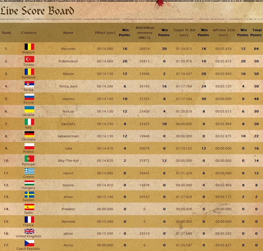 Pe parcursul următoarelor şapte ore şi 20 minute, toţi cei 17 concurenţi s-au străduit să obţină cele mai bune rezultate cu componentele puse la dispoziţie de GIGABYTE folosind sisteme de răcire cu azot lichid pentru procesor, respectiv chiar şi pentru modulele de memorie RAM în unele cazuri. În acest scop, GIGABYTE a pus la dispoziţia participanţilor o cantitate semnificativă de azot lichid. Overclockerii au fost supravegheaţi de angajaţi GIGABYTE, iar celebrul overclocker hicookie a asigurat suportul tehnic şi înregistrarea scorurilor înaintate de participanţi. Concurentul din partea Olandei nu a putut să se prezinte la eveniment, iar locul acestuia a fost luat de Pieter-Jan “Massman” Plaisier din Belgia.