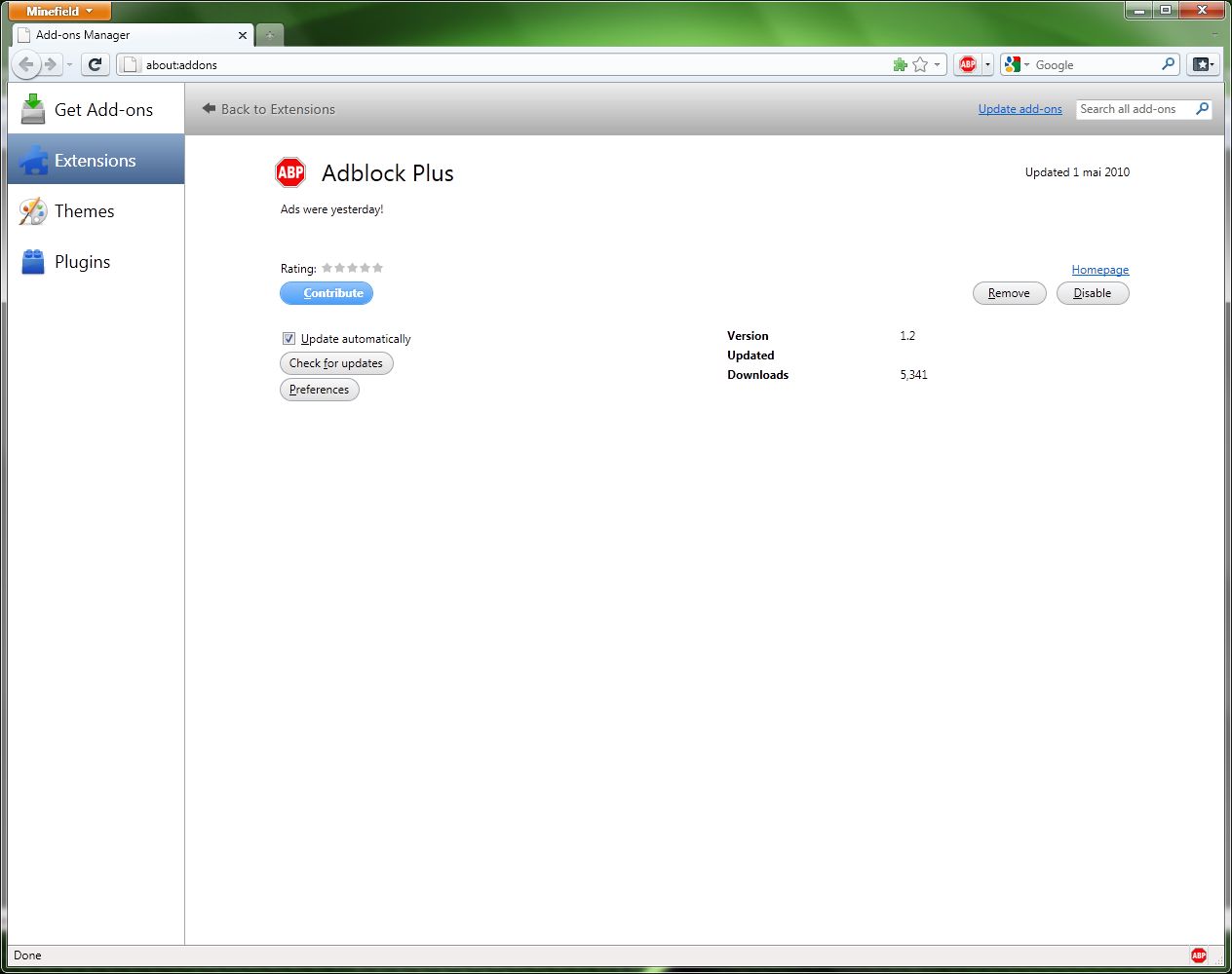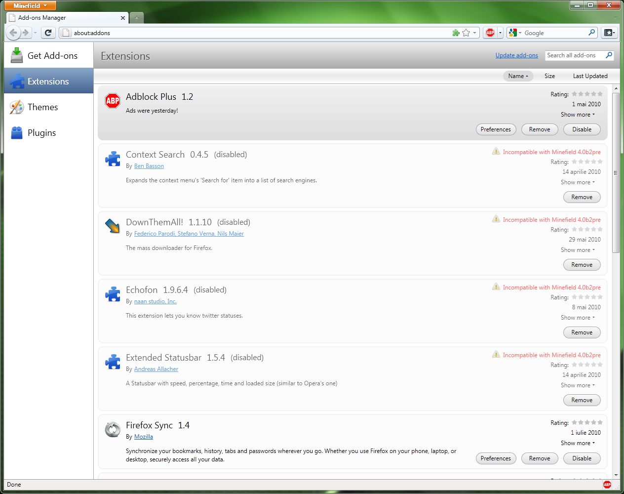 Opţiunile avansate ale aplicaţiei nu conţin nici o modificare vizibilă, modulul de management al extensiilor, temelor şi plugin-urilor fiind însă complet refăcut. Mai spaţios, acesta nu se mai deschide într-o fereastră separată, permite vizualizarea mai rapidă a notelor primite de extensii şi a datelor ultimei actualizări. Acesta aduce o facilitate interesantă de actualizare automată invizibilă care nu mai plictiseşte utilizatorii cu întrebări suplimentare, acesta funcţionând deja deoarece primele actualizări menite să aducă compatibilitatea cu noua versiune 4.0 Beta au început deja să fie furnizate. Compatibilitatea cu vechile extensii nu este însă deloc grozavă, păcălirea acestora prin modificarea versiunii maxime permise aducând o serie largă de probleme, cum ar fi extensii care nu pornesc, care pornesc dar a căror butoane sau meniuri nu funcționează sau care par că sunt active dar de fapt nu fac nimic.