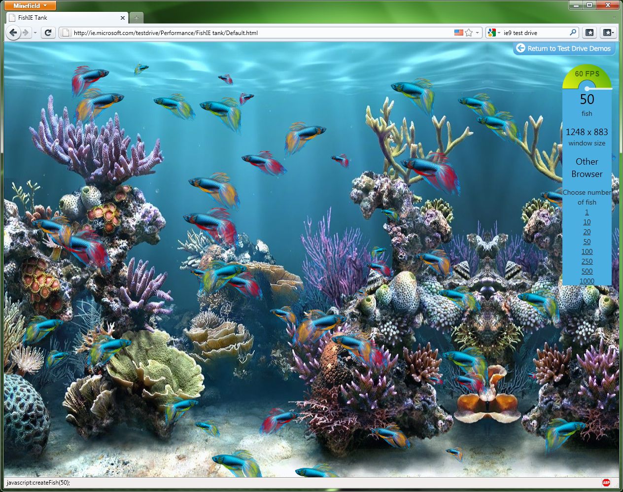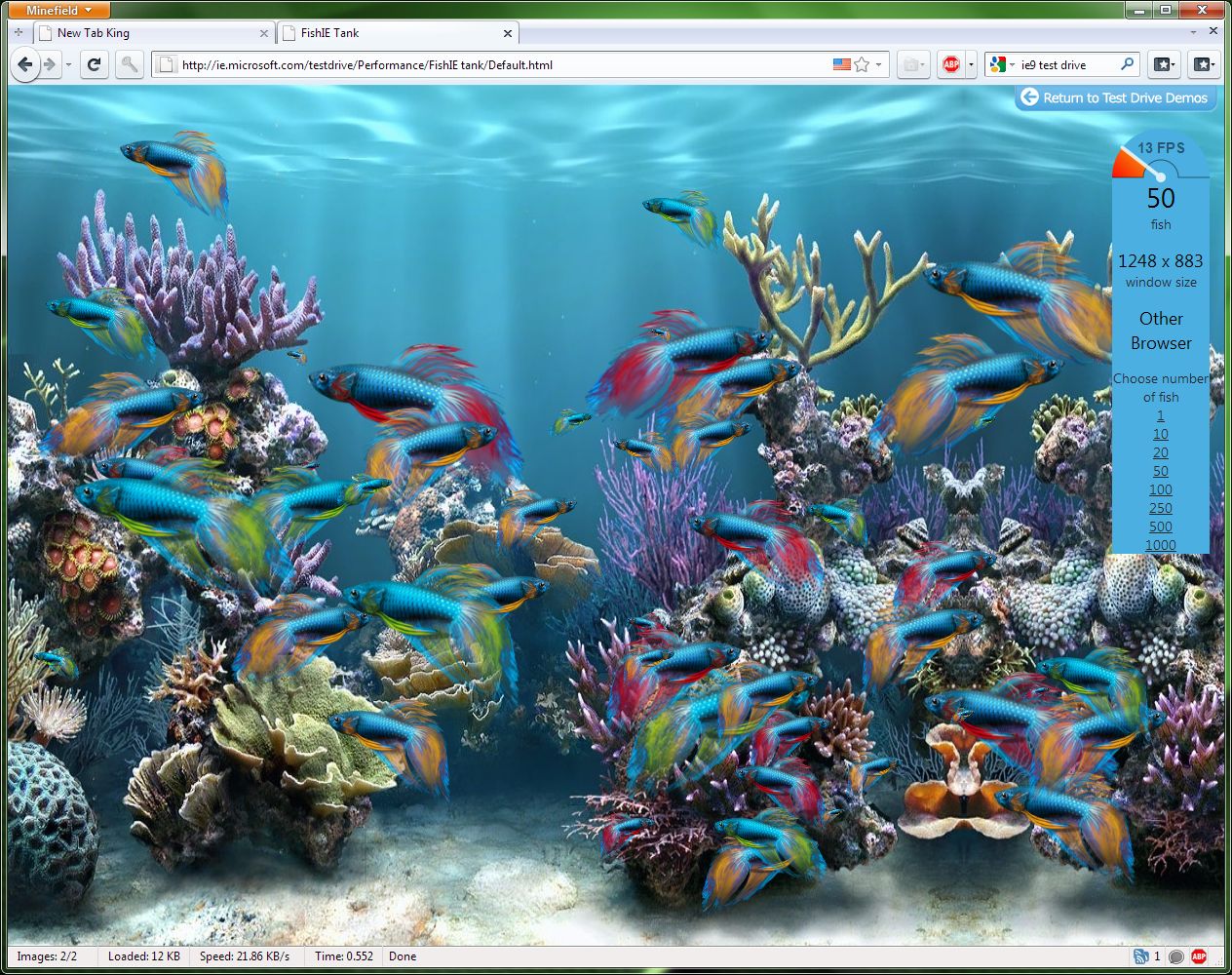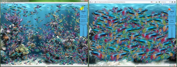 Am ales testul FishIE Tank deoarece este cel mai impresionat şi cel mai dur, Firefox începând să sufere scăderi de performanță doar atunci când am ales un număr de 250 de elemente active (peşti). Faţă de Internet Explorer 9 Platform Preview 3, accelerarea din Firefox 4.0 Beta se dovedeşte a fi mai puţin performantă.