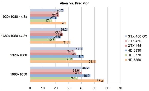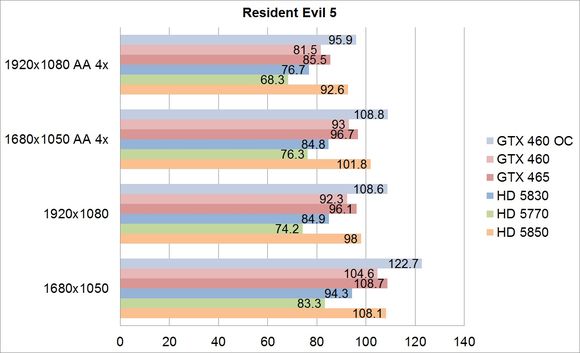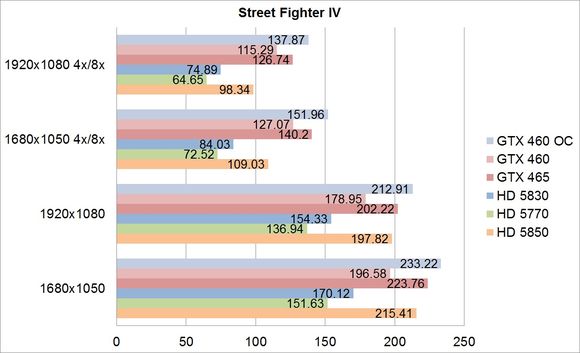 Street Fighter IV este un al joc în care GTX 460 îşi demonstrează superioritatea, în unele cazuri reuşind depăsirea lui Radeon HD 5850. De asemenea, în Resident Evil 5 se situează periculos de aproape de Radeon HD 5850. NVIDIA încă are probleme serioase în Just Cause 2, unde nu reuşeşte să se apropie de rezultatele obţinute de concurenţă. În Alien vs. Predator, placa NVIDIA se situează cam la acelaşi nivel cu Radeon HD 5770, iar pentru a echivala HD 5830 este necesară aplicarea frecvenţelor de overclocking.