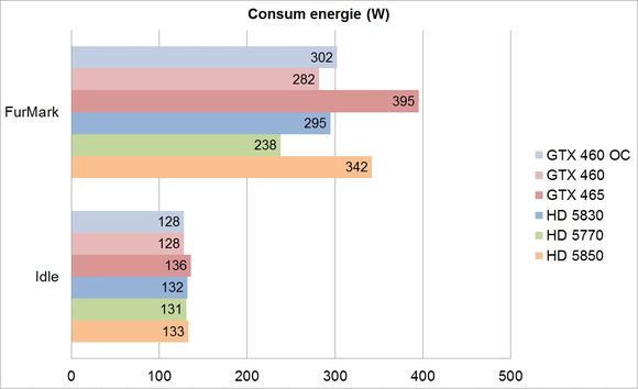 Aşa cum reiese din măsurătorile efectuate, GeForce GTX 460 nu se încălzeşte prea mult şi nici nu consumă prea multă energie pentru performanţele pe care le oferă. În plus, nici creşterea frecventelor nu a atras penalizări semnificative de consum sau temperatură. Astfel, am obţinut un spor de performanţă mediu în jocurile rulate de 17.27%, în timp ce temperatura a crescut cu numai 4.3%, iar consumul de energie a înregistrat o creştere de circa 7.1%.