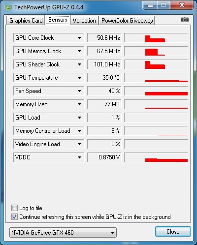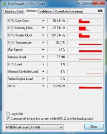 La fel ca şi celelalte plăci video din familia GeForce 400, GTX 460 foloseşte în idle frecvenţele 50/101/270 MHz.
