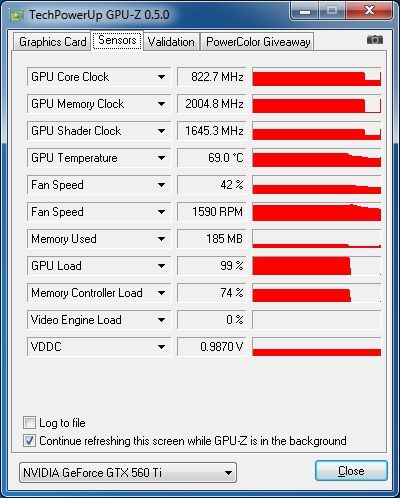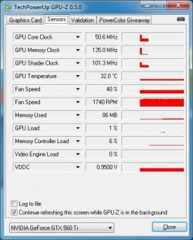 Pentru GeForce GTX 560 Ti, GPU-Z raportează tensiuni de alimentare de 0.95V în idle şi de 0.987V în sarcină.
