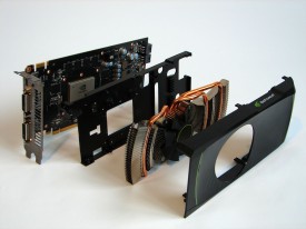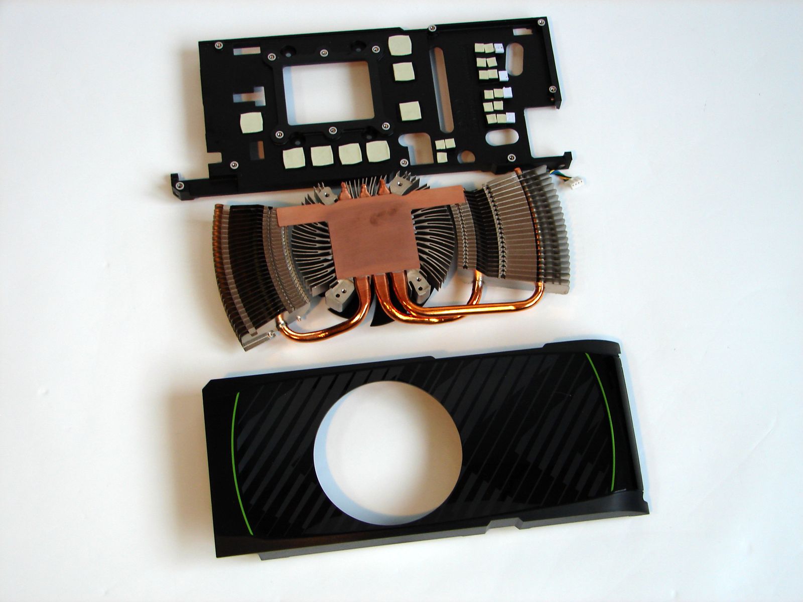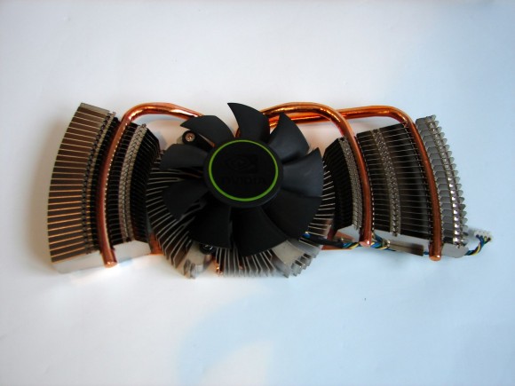 Heatsink-ul care preia căldura produsă de nucleul grafic are dimensiuni mai mari decât în cazul lui GTX 460 (probabil de aici şi lungimea mai mare a plăcii) şi utilizează trei heatpipe-uri cu diametrul de 6mm.
